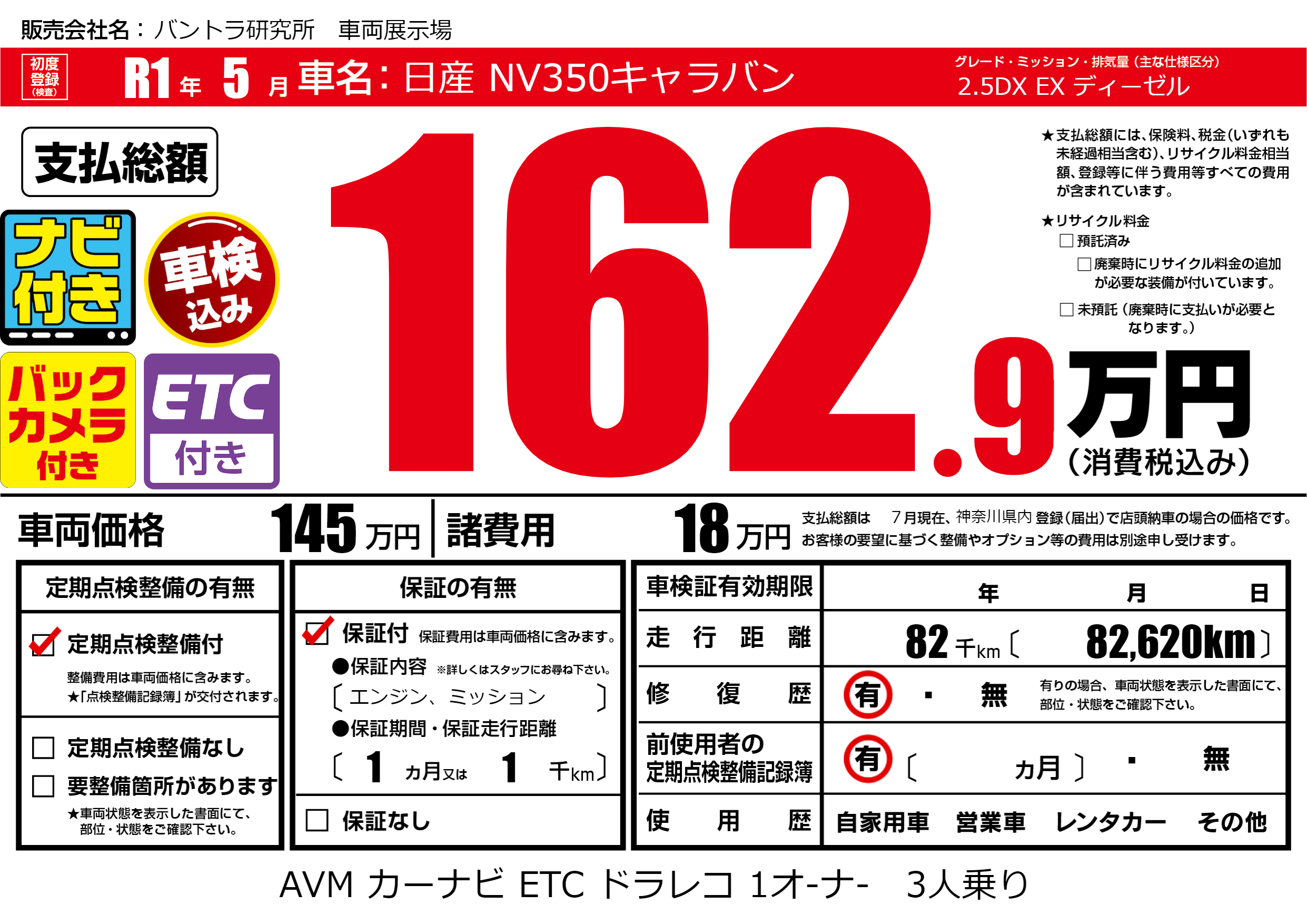 | 車名 | 日産 NV350キャラバン | グレード ミッション 排気量 |