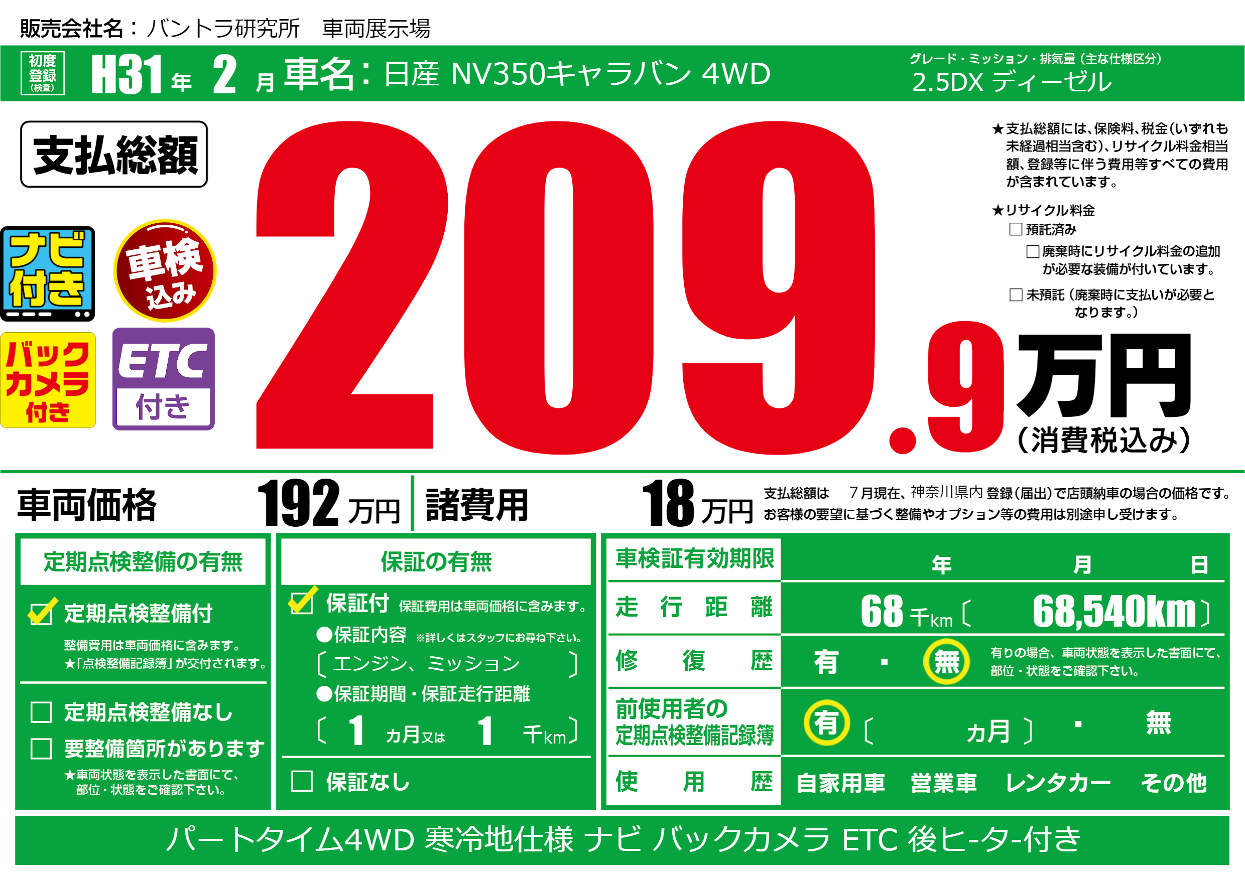 | 車名 | 日産 NV350キャラバン 4WD | グレード ミッション 排気量 |