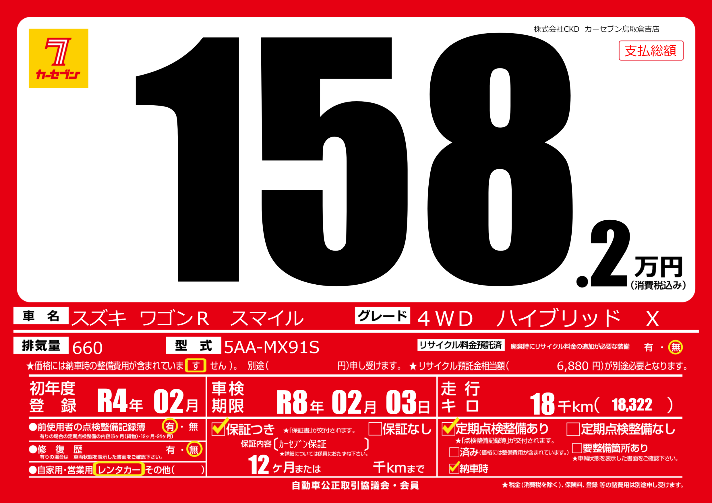 | 走行キロ | 1.8万km | 初年度登録 | R4年02月 |