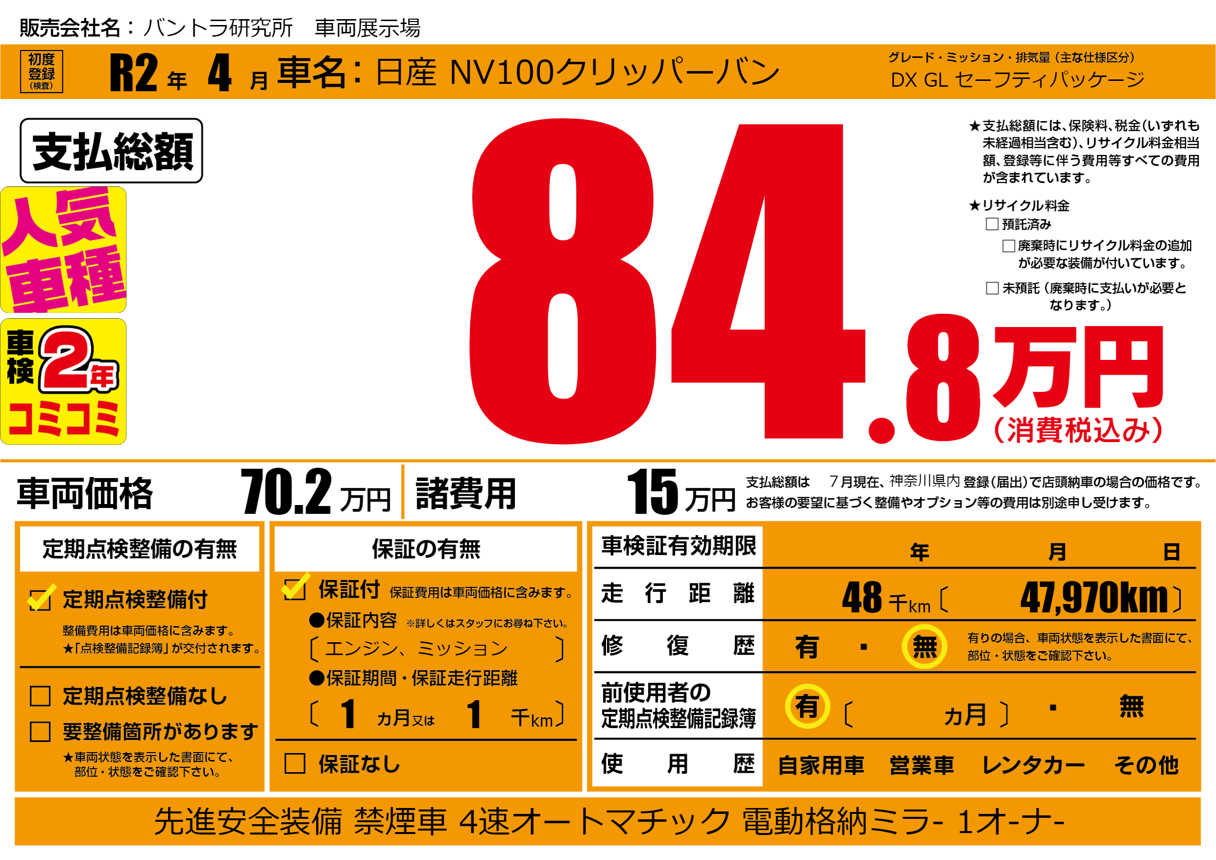 | 車名 | 日産 NV100クリッパーバン | グレード ミッション 排気量 |