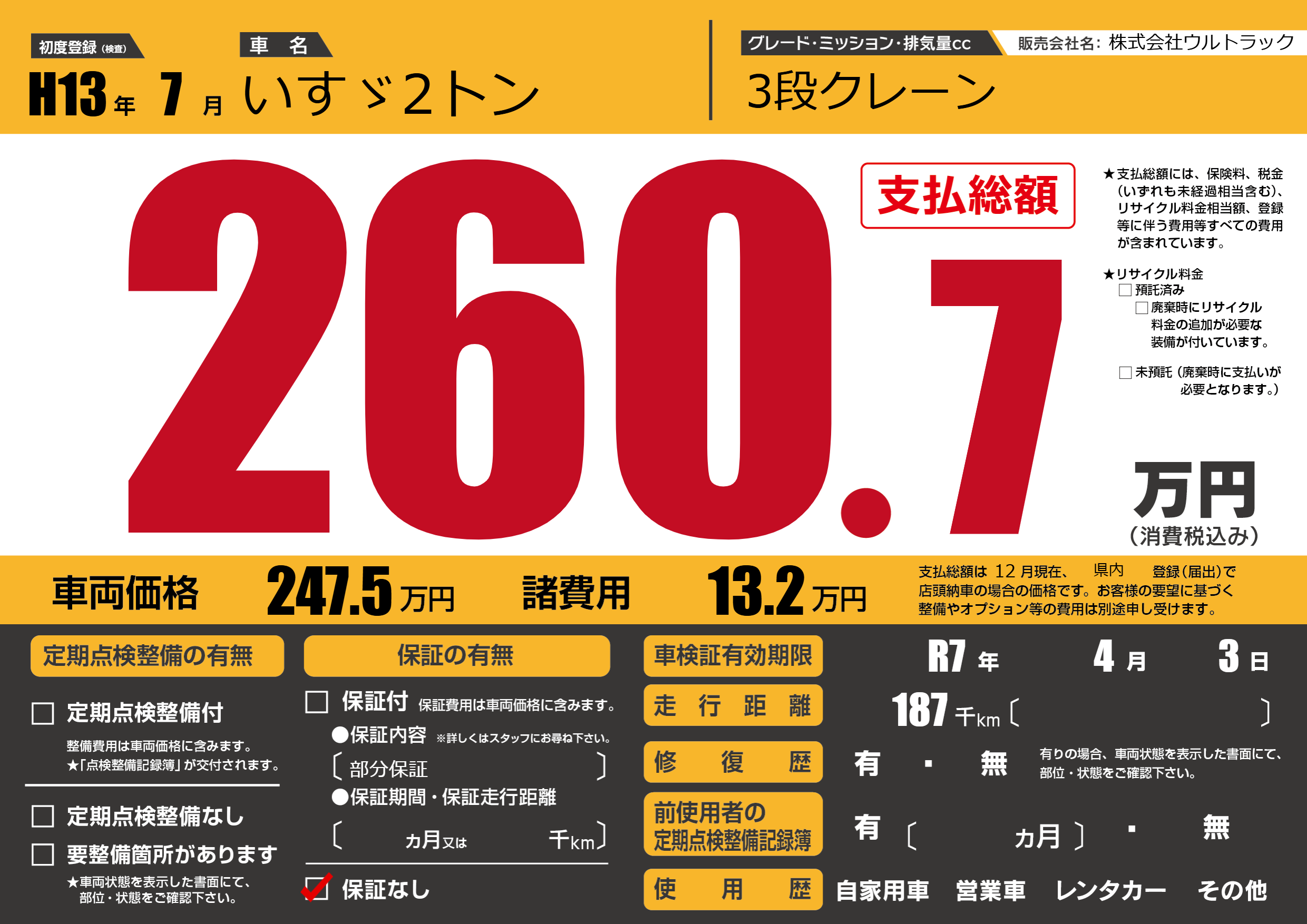 | 走行キロ | 18.7万km | 初年度登録 | H13年7月 |