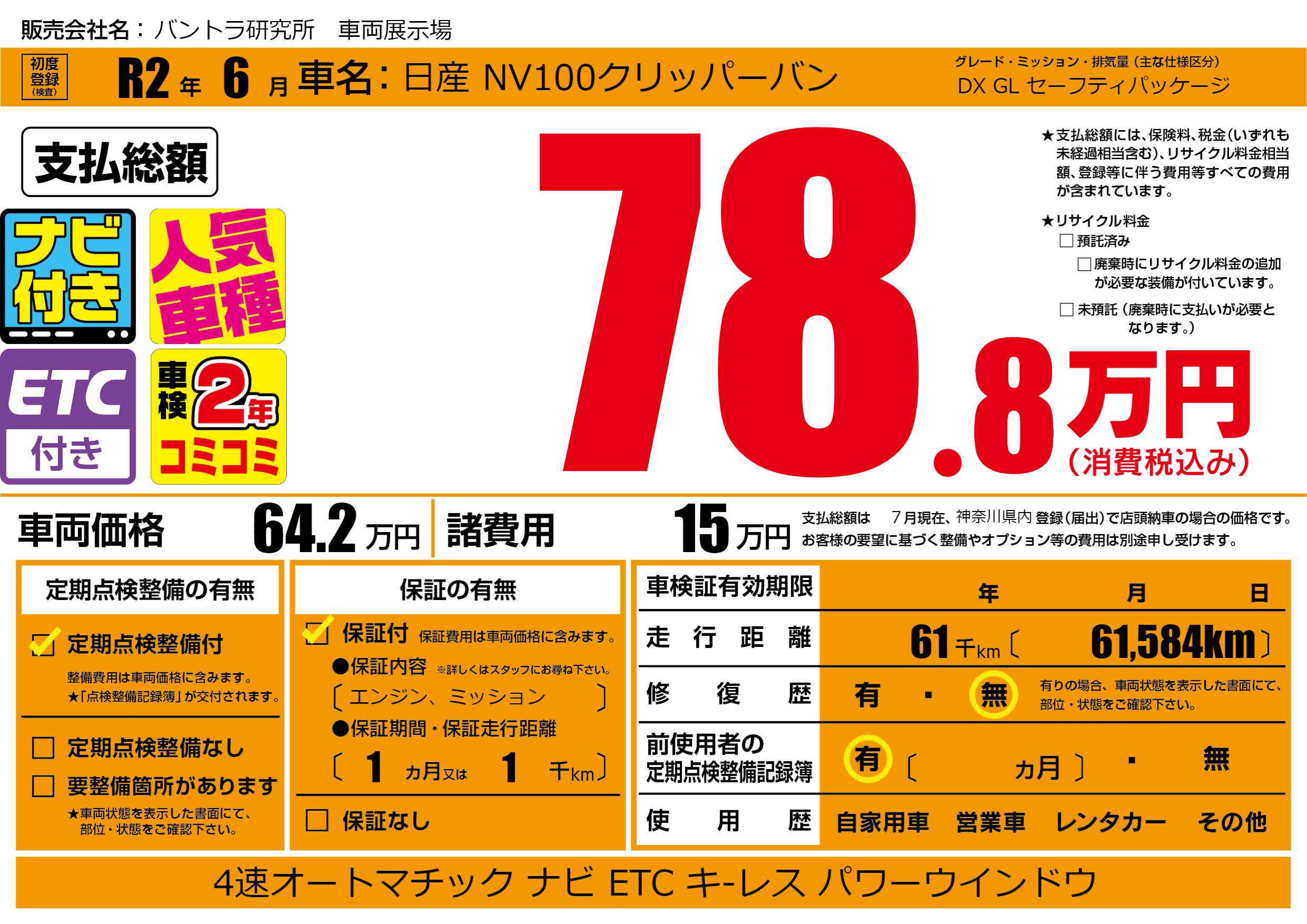 | 車名 | 日産 NV100クリッパーバン | グレード ミッション 排気量 |
