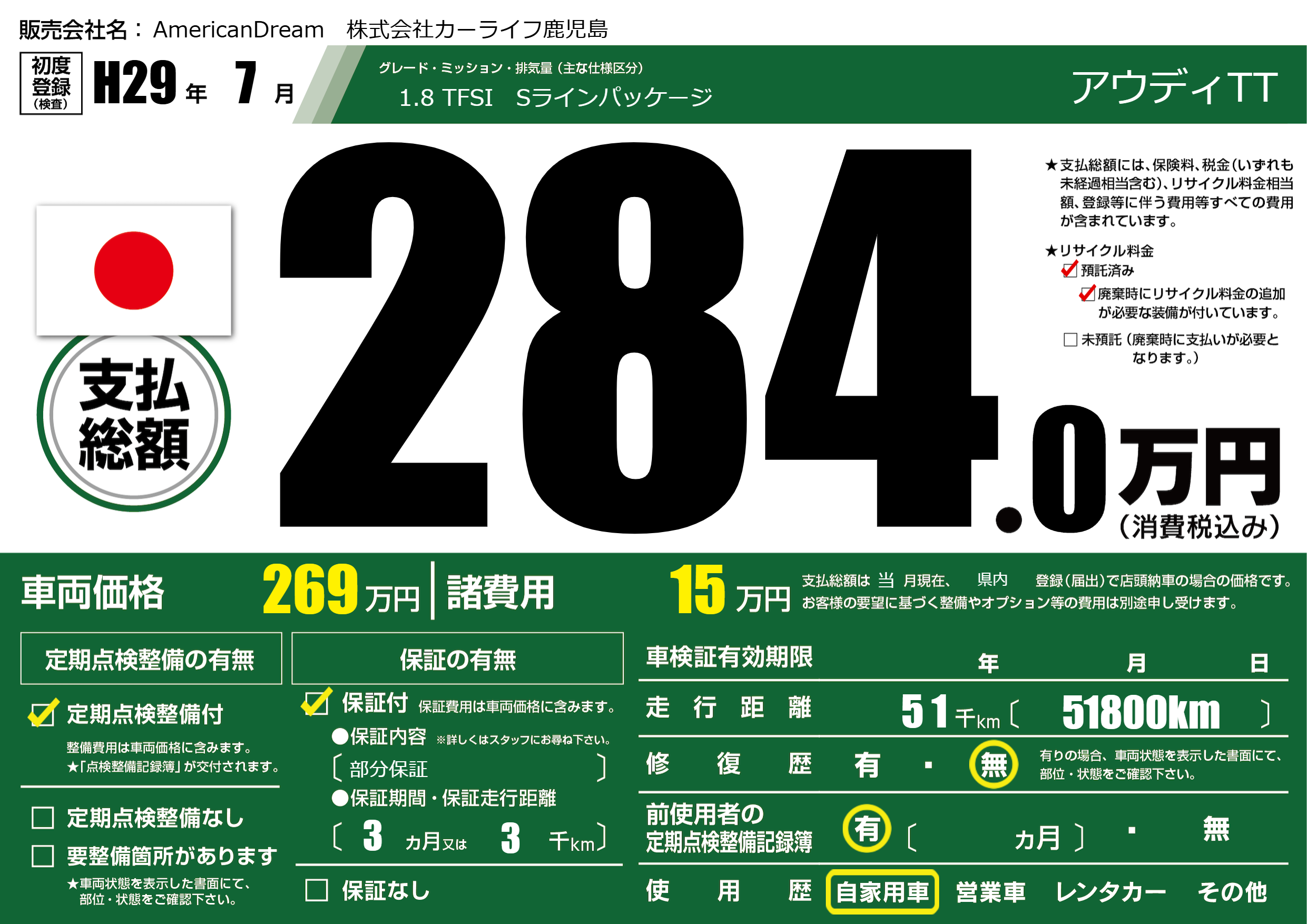 | 車名 | アウディTT | グレード ミッション 排気量 |