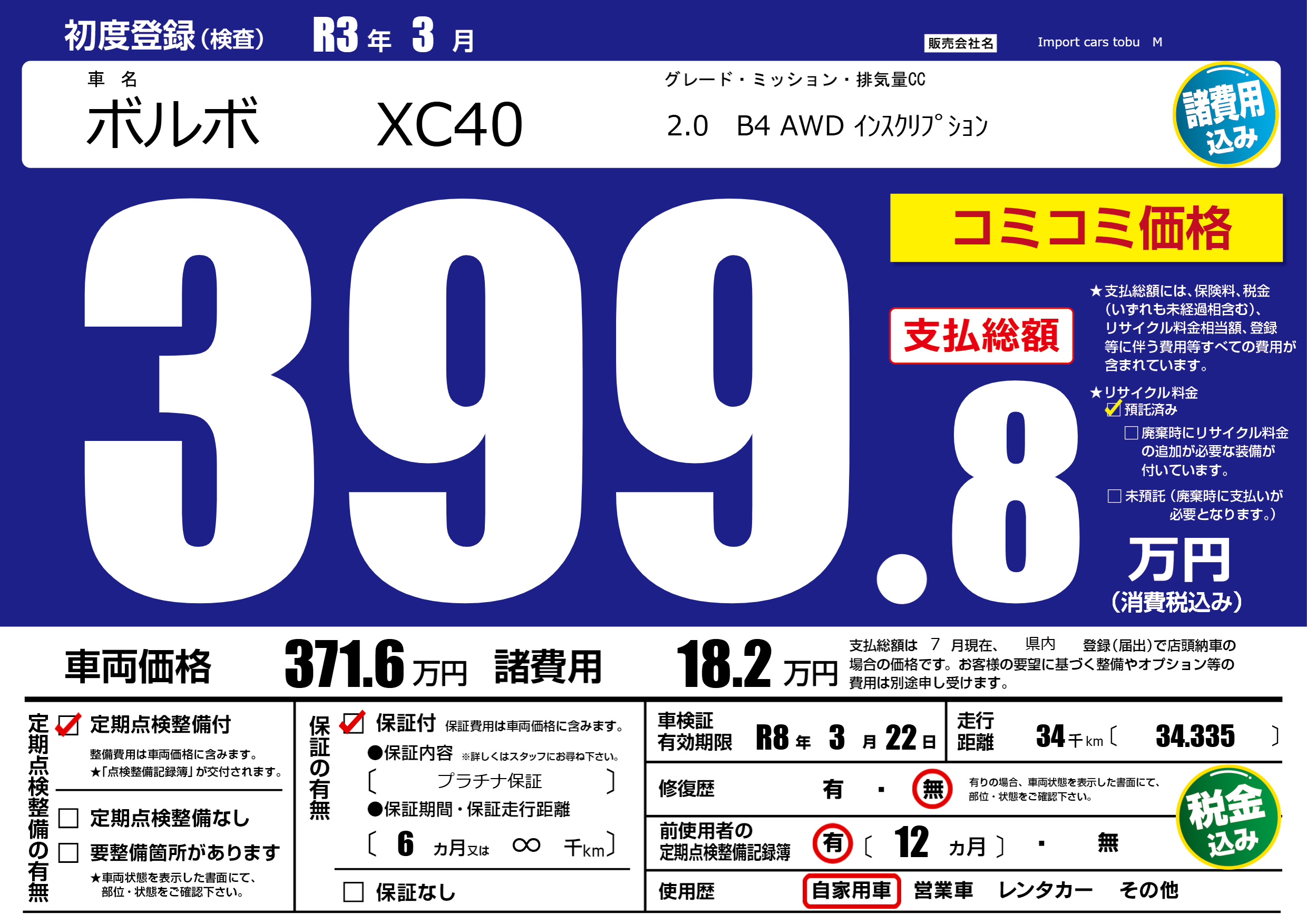 | 走行キロ | 3.4万km | 初年度登録 | R3年3月 |