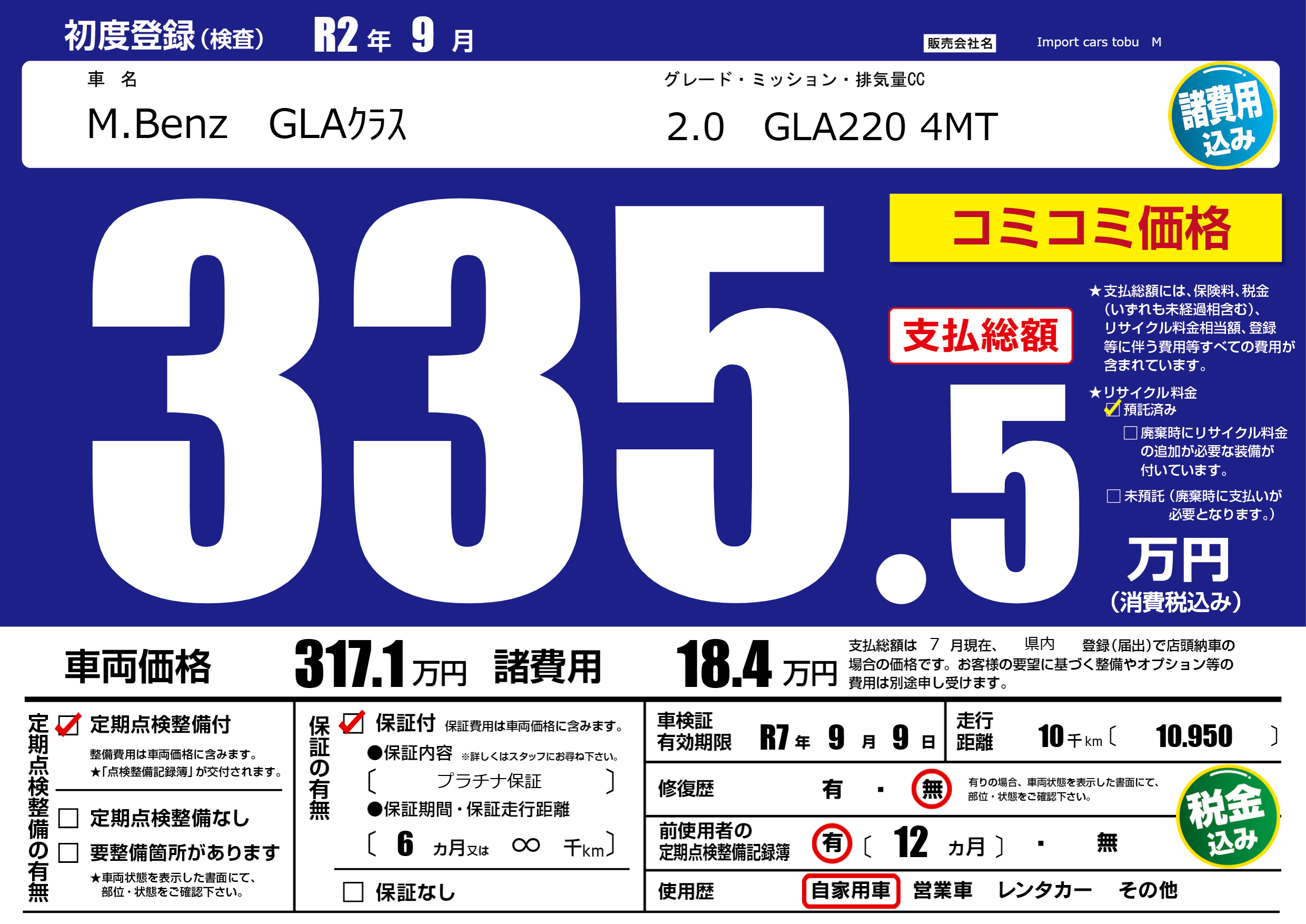 | 車名 | M.Benz GLAクラス | グレード ミッション 排気量 |