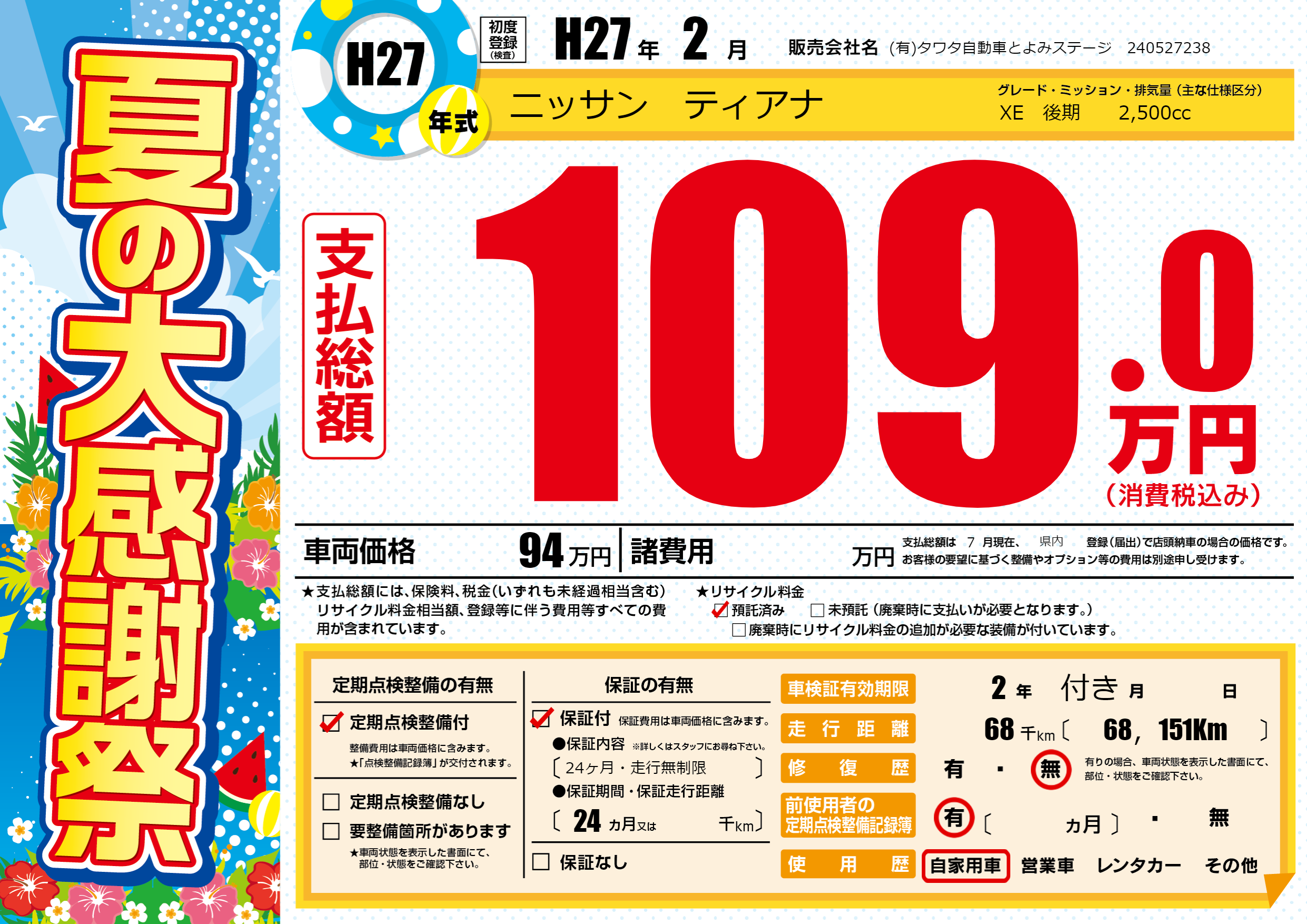 | 車名 | ニッサン ティアナ | グレード ミッション 排気量 |