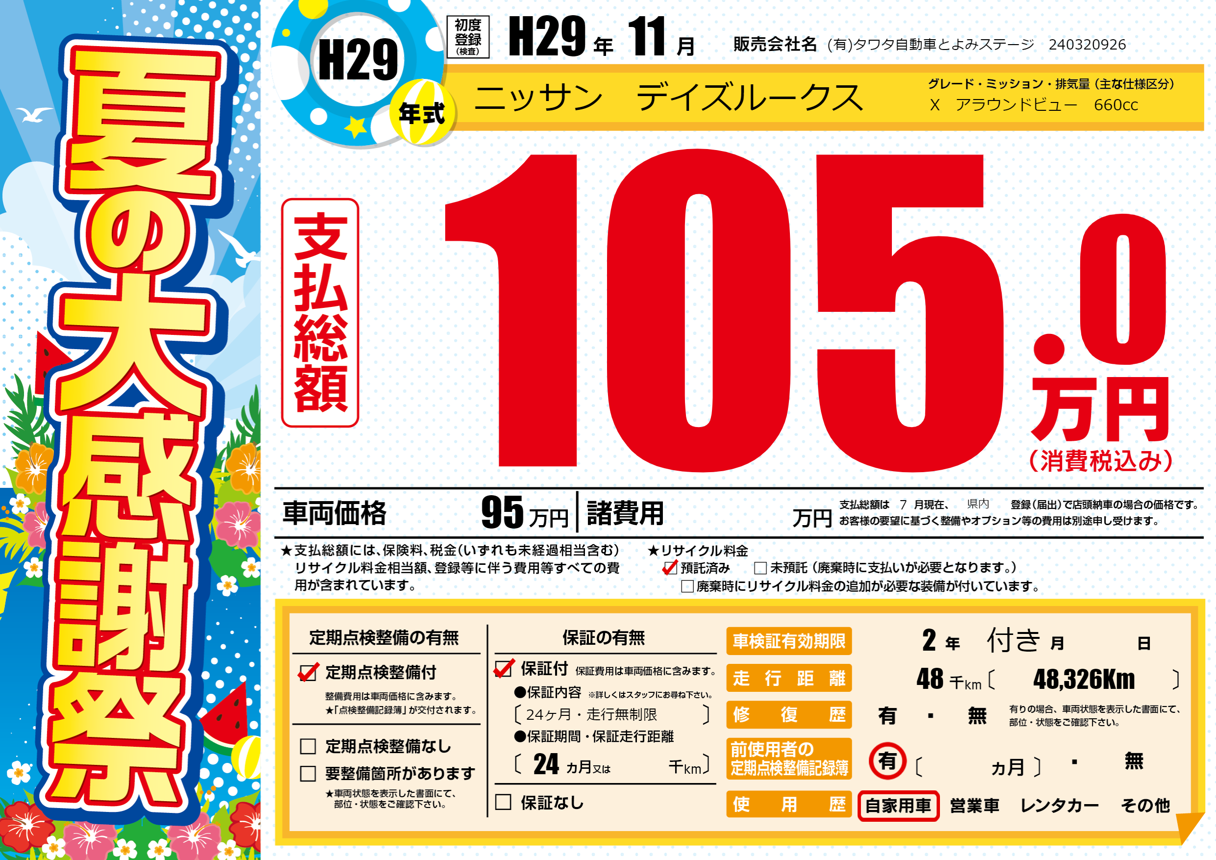| 走行キロ | 4.8万km | 初年度登録 | H29年11月 |