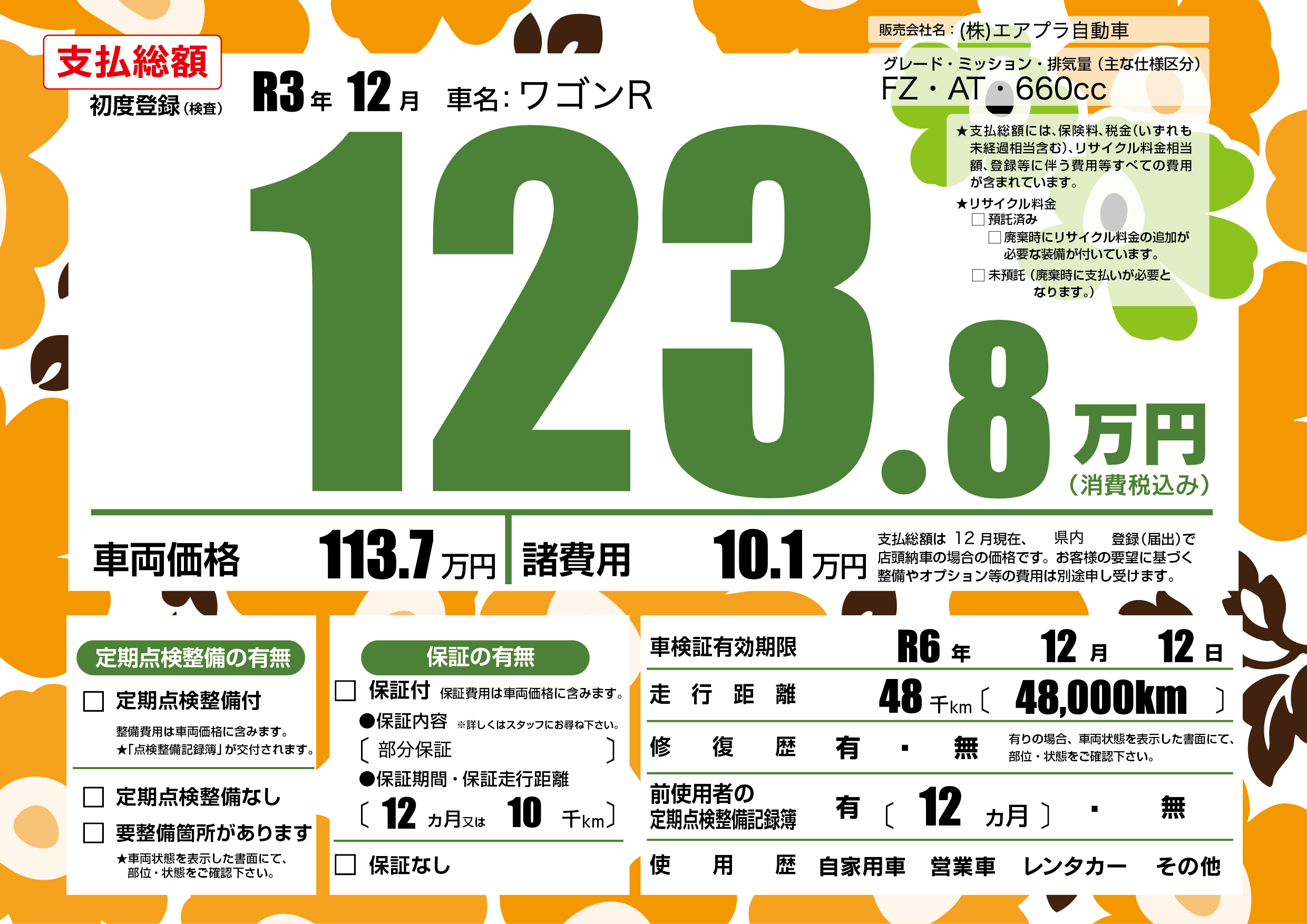 | 車名 | ワゴンR | グレード ミッション 排気量 |
