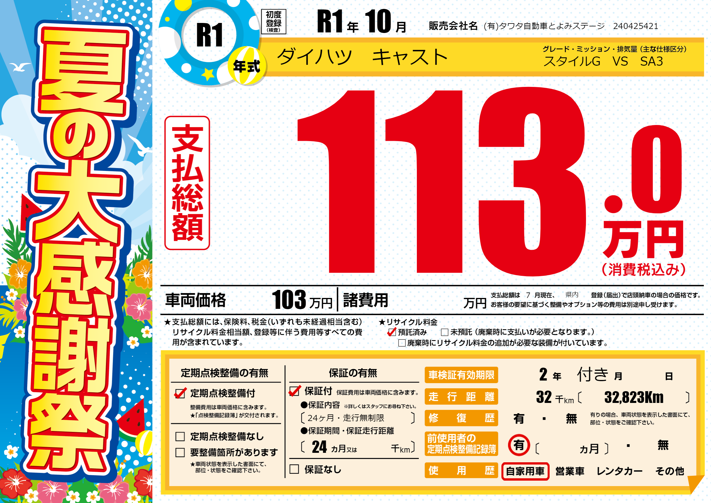 | 走行キロ | 3.2万km | 初年度登録 | R1年10月 |