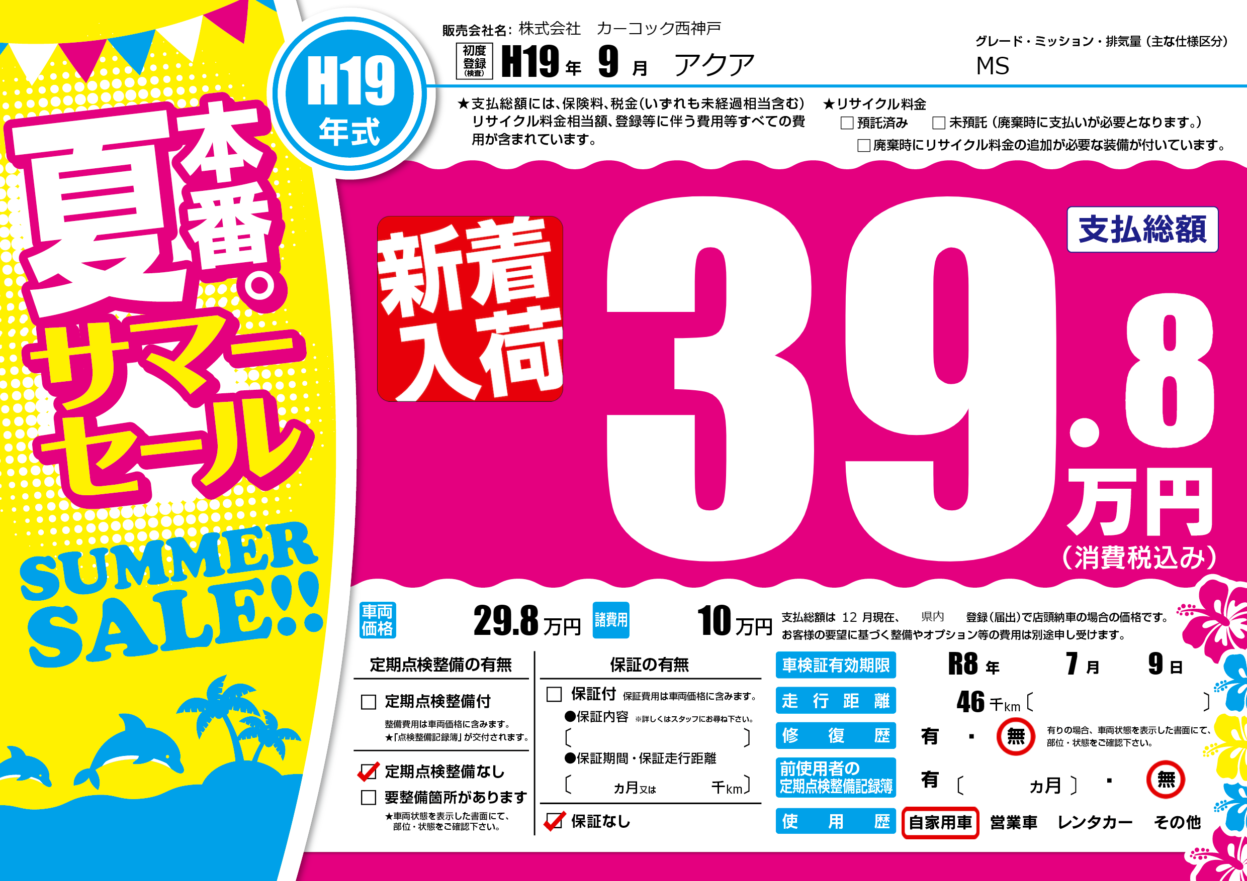 | 走行キロ | 4.6万km | 初年度登録 | H19年9月 |