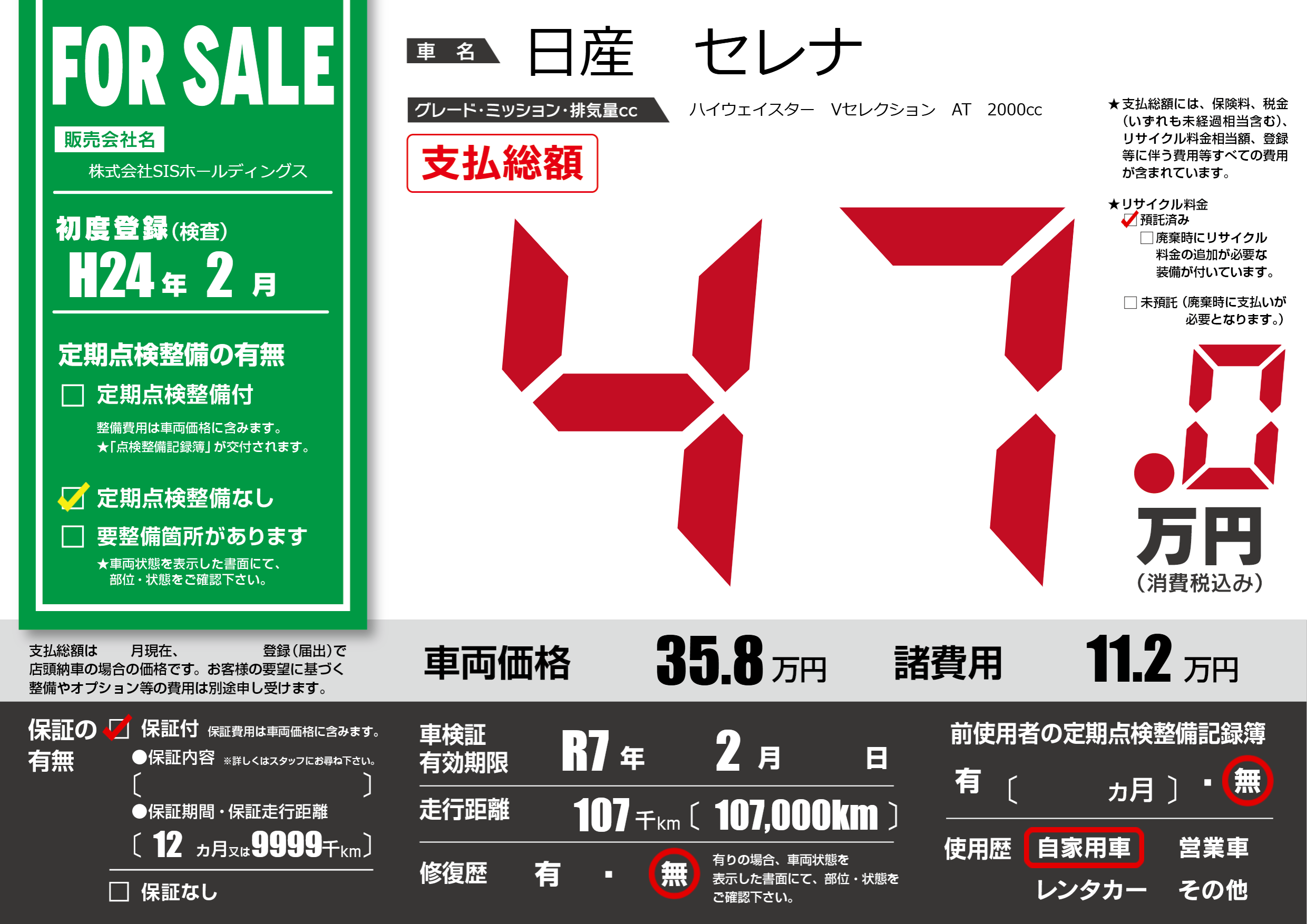 | 車名 | 日産 セレナ | グレード ミッション 排気量 |