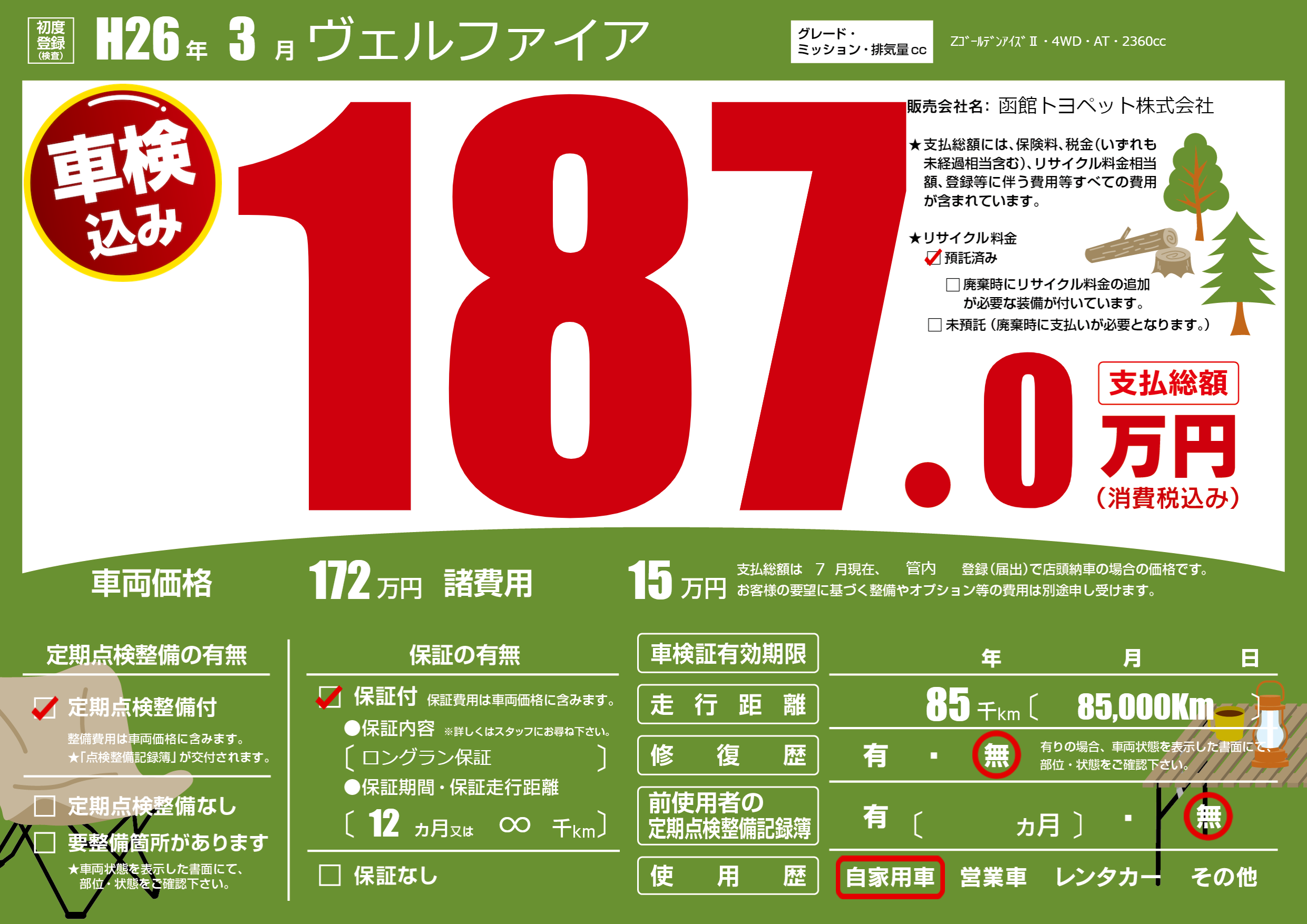 | 車名 | ヴェルファイア | グレード ミッション 排気量 |