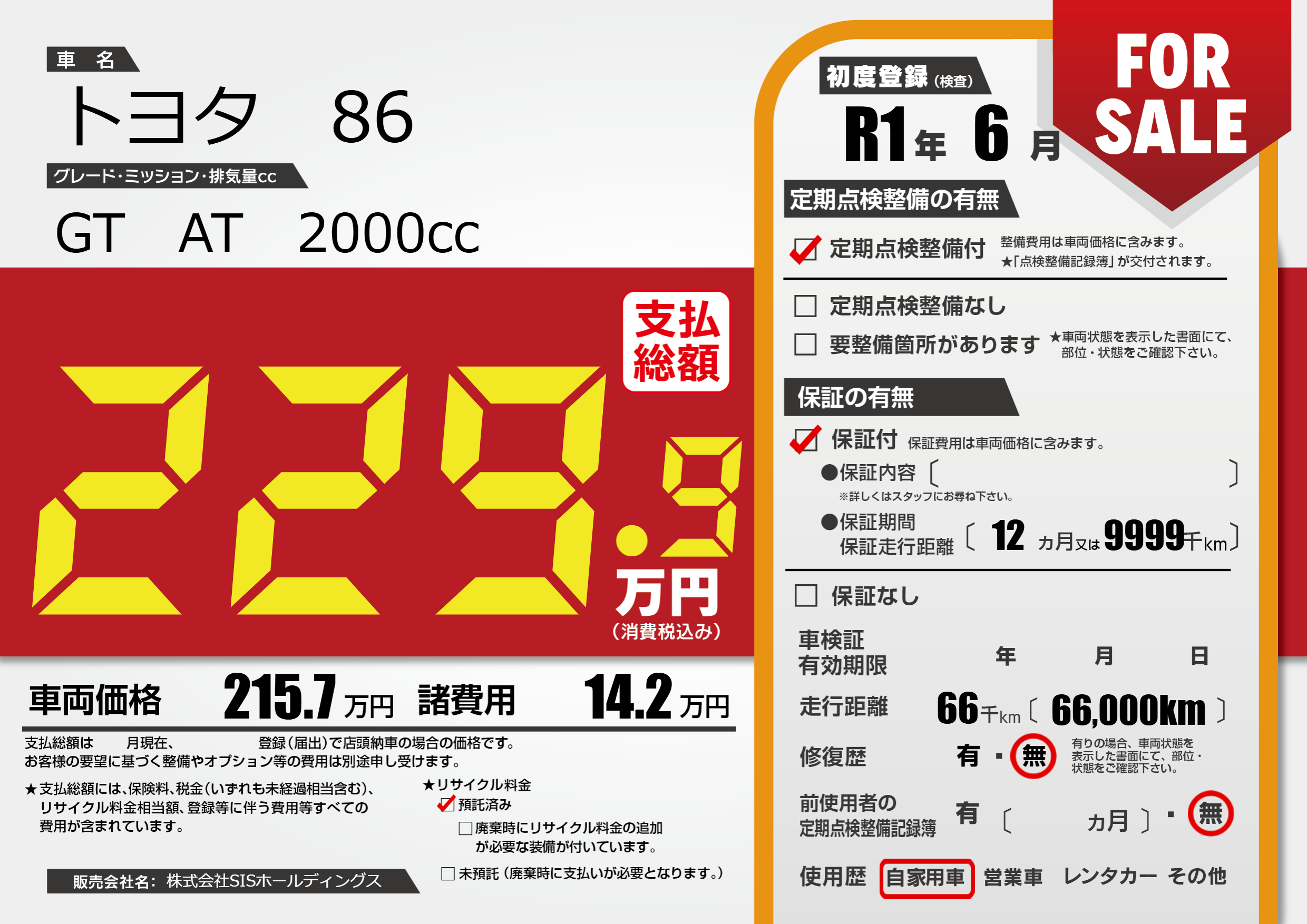 | 車名 | トヨタ 86 | グレード ミッション 排気量 |