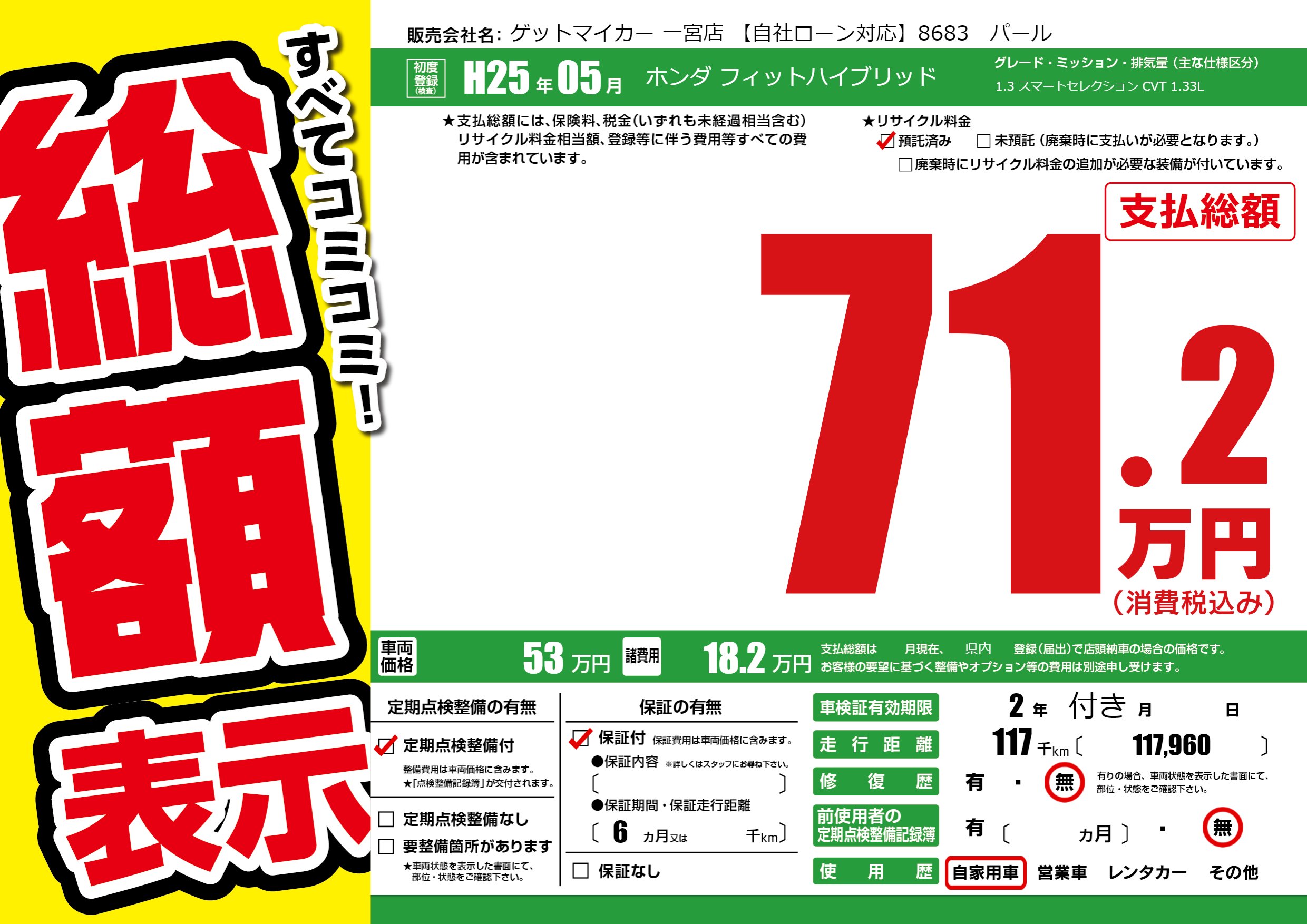 | 走行キロ | 11.7万km | 初年度登録 | H25年05月 |