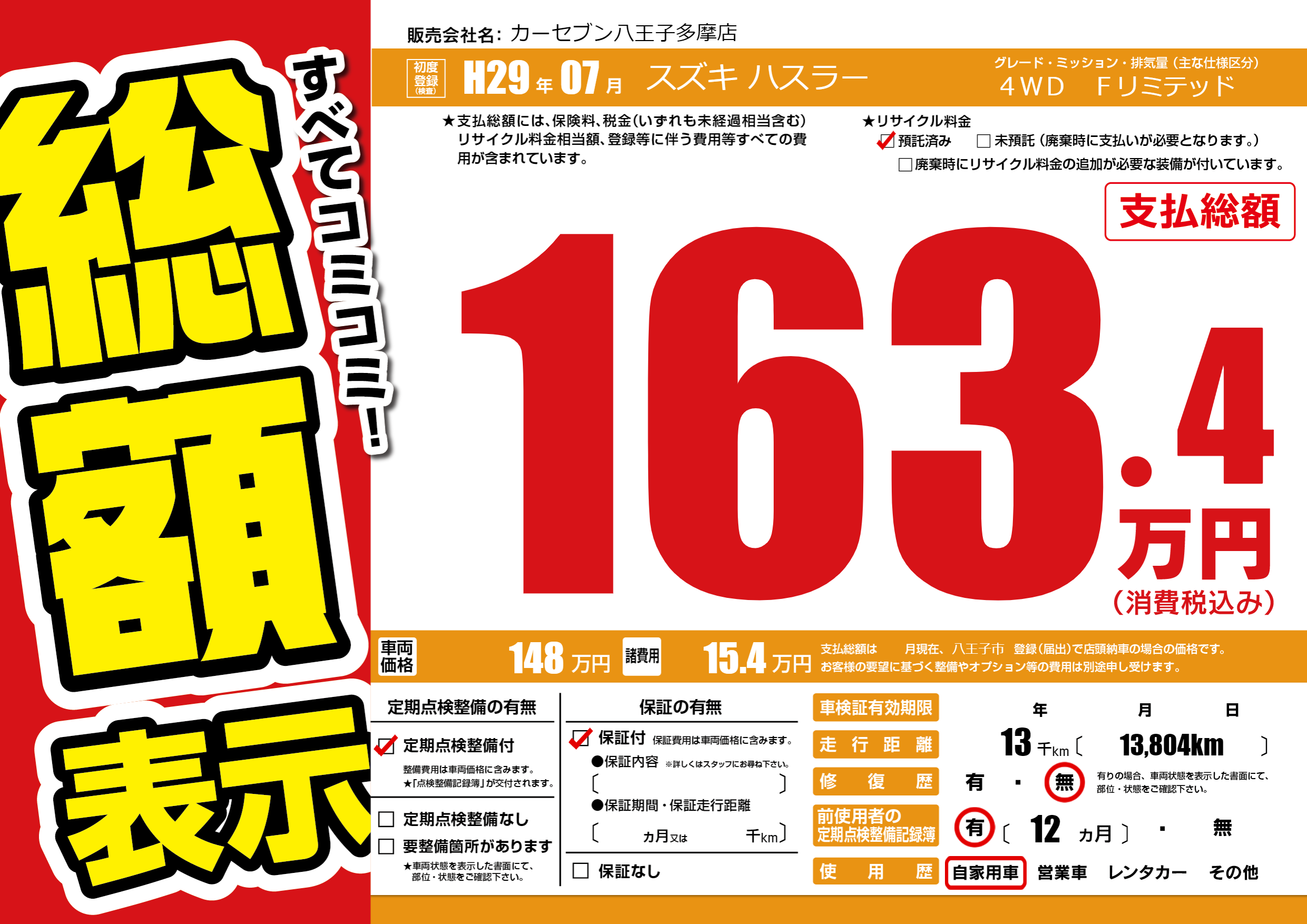 | 車名 | スズキ ハスラー | グレード ミッション 排気量 |