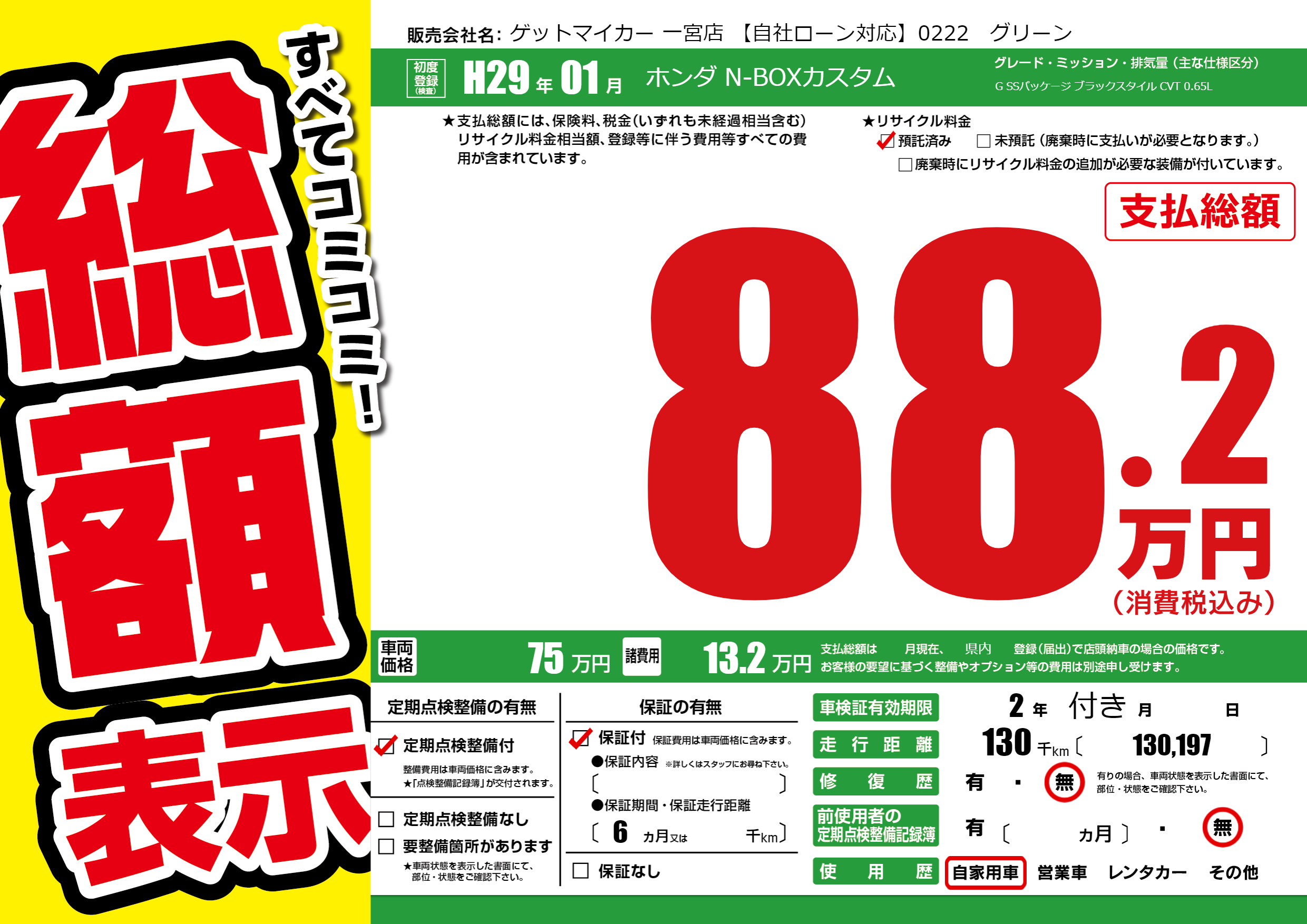 | 走行キロ | 13万km | 初年度登録 | H29年01月 |