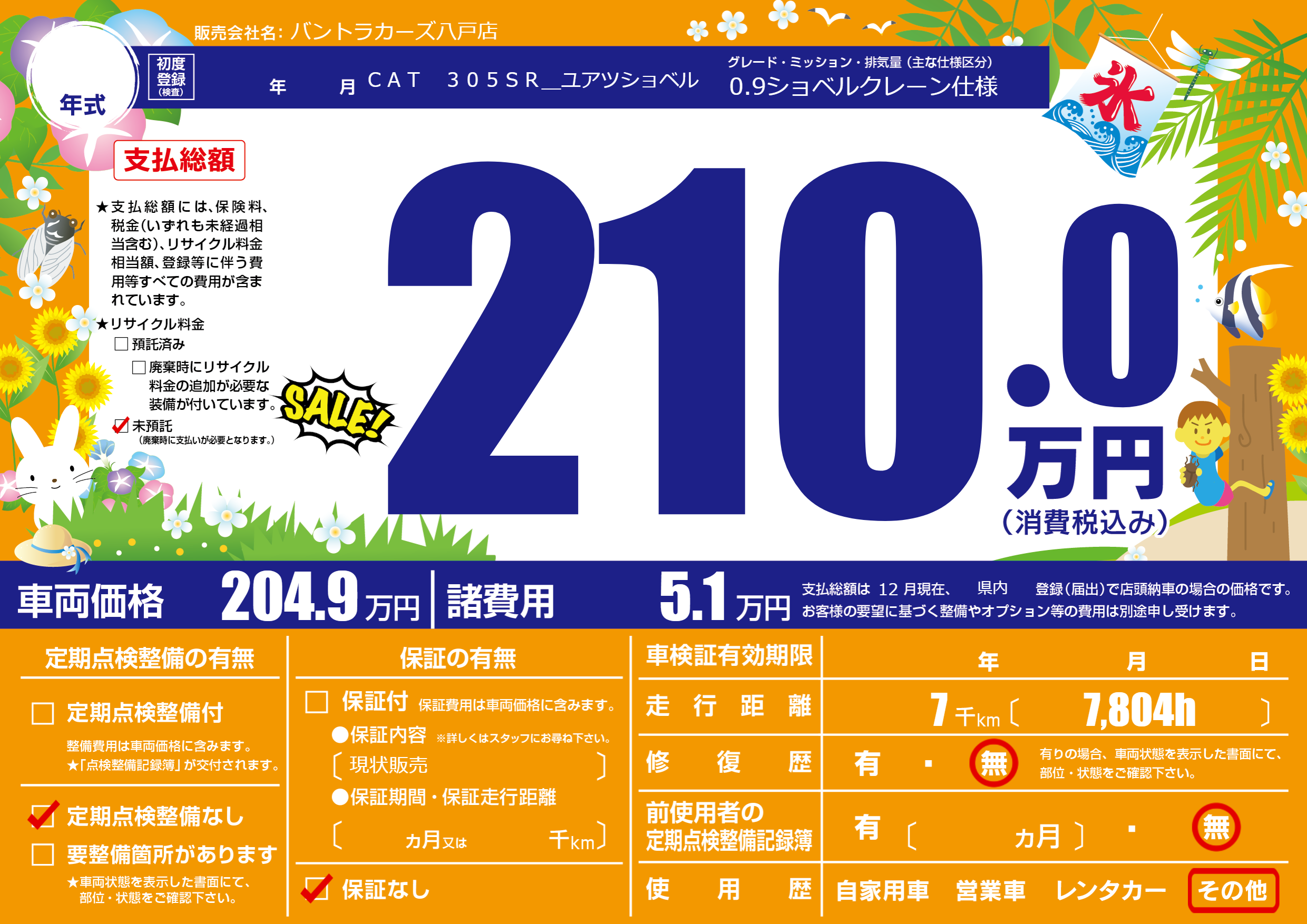 保証なし 保証内容(現状販売) ---ヶ月または()千kmまで |