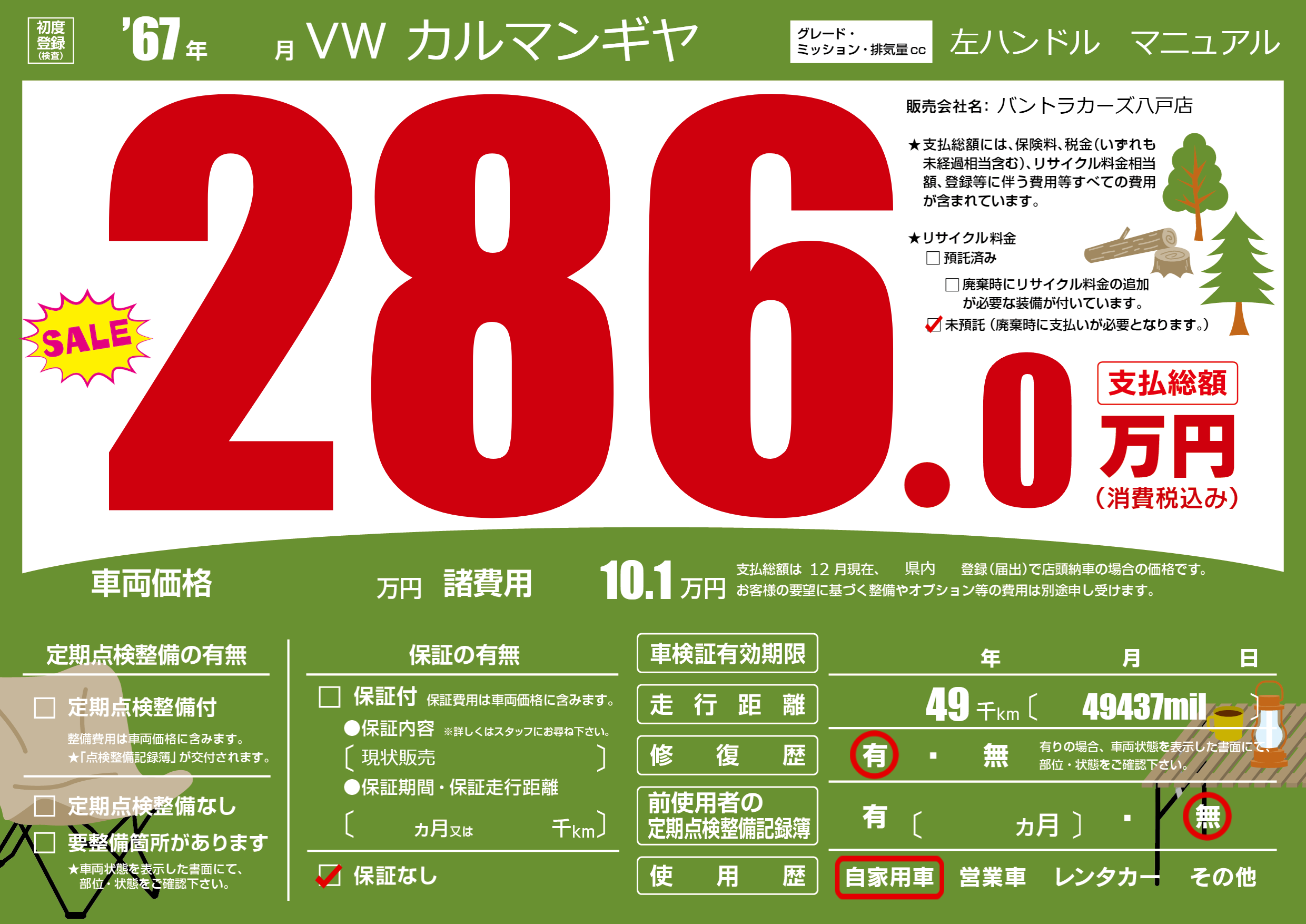 | 車名 | VW カルマンギヤ | グレード ミッション 排気量 |