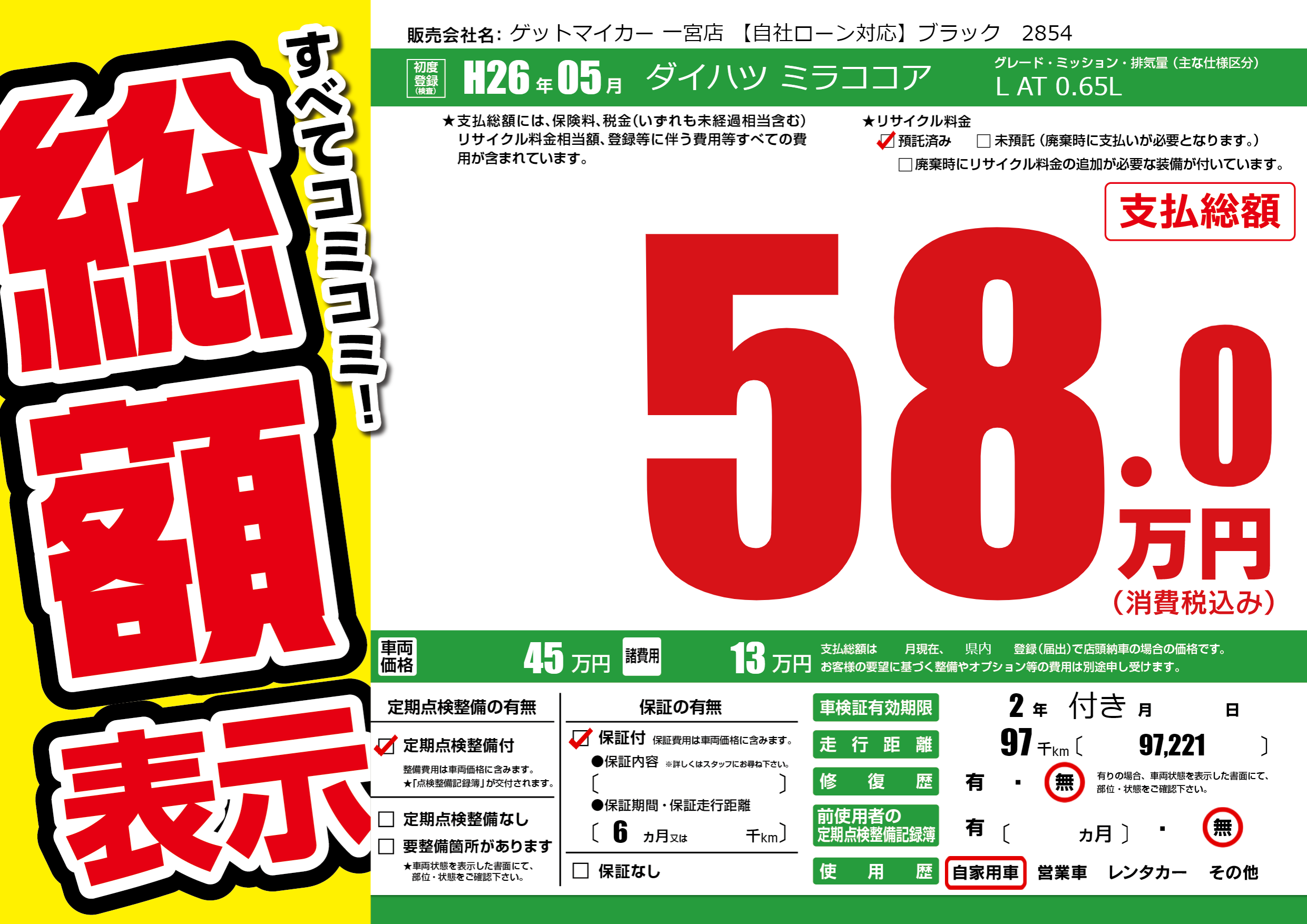| 車名 | ダイハツ ミラココア | グレード ミッション 排気量 |