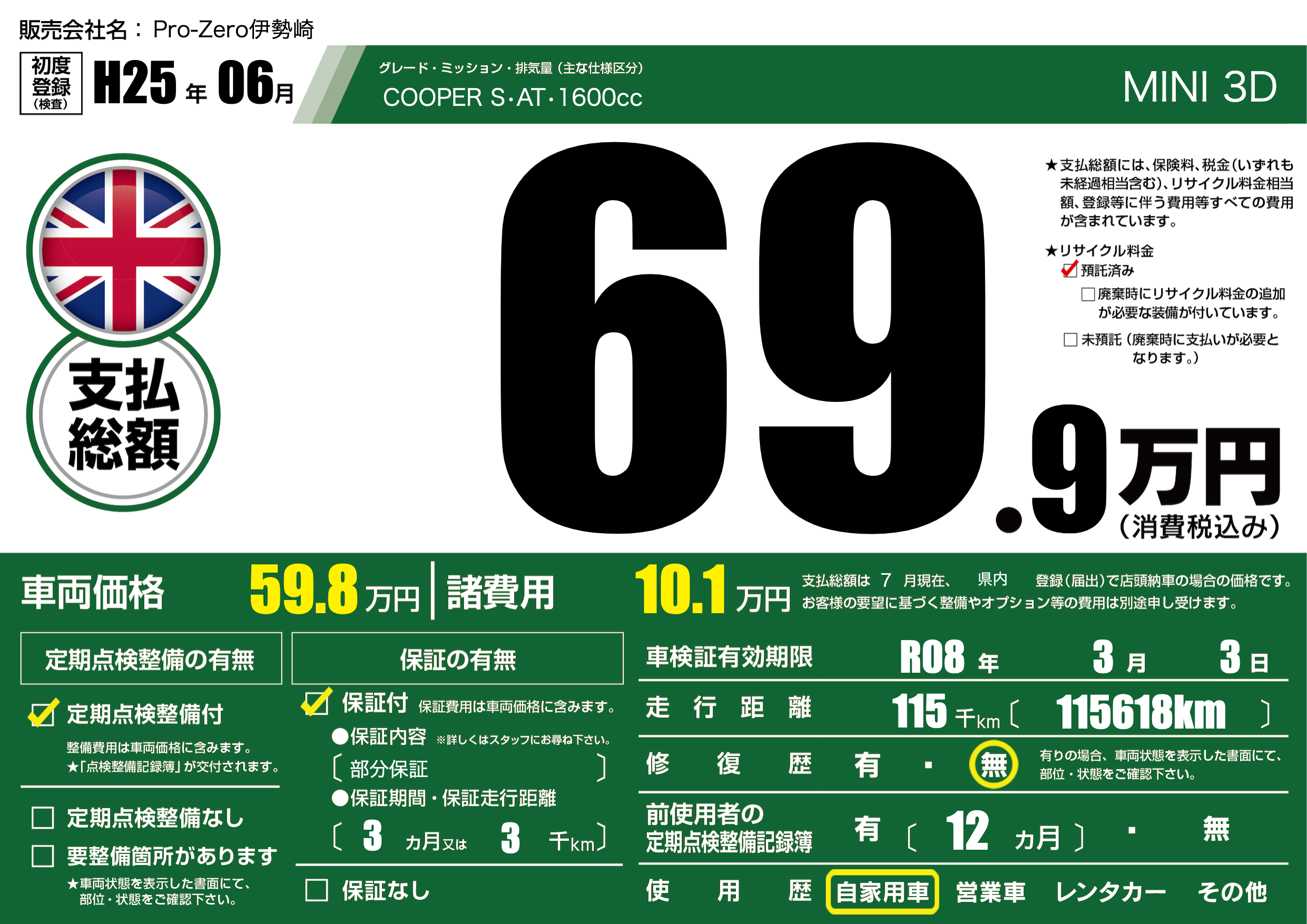| 車名 | MINI 3D | グレード ミッション 排気量 |