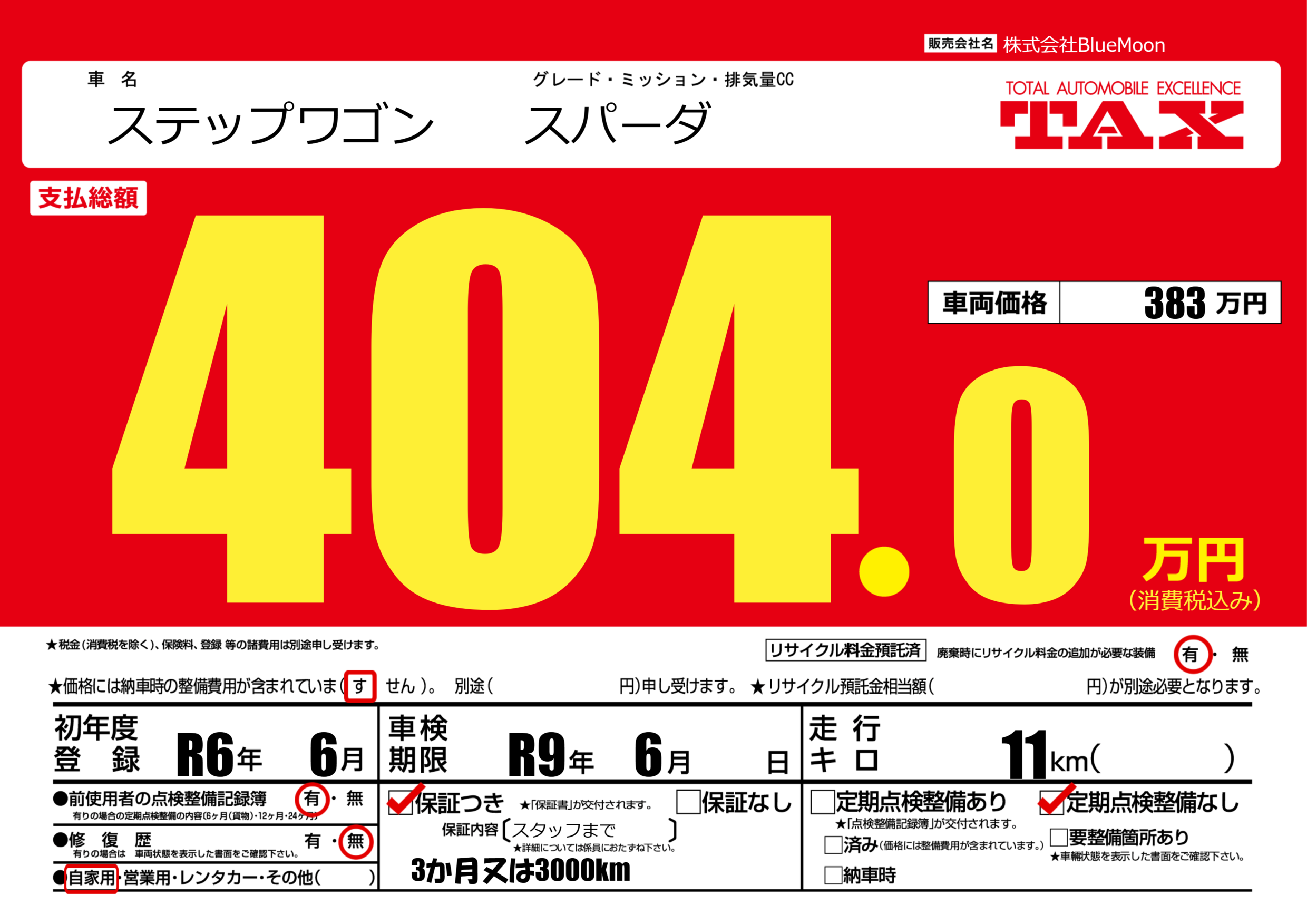 | 車検制限 | R9年 6月 - 日 | ||