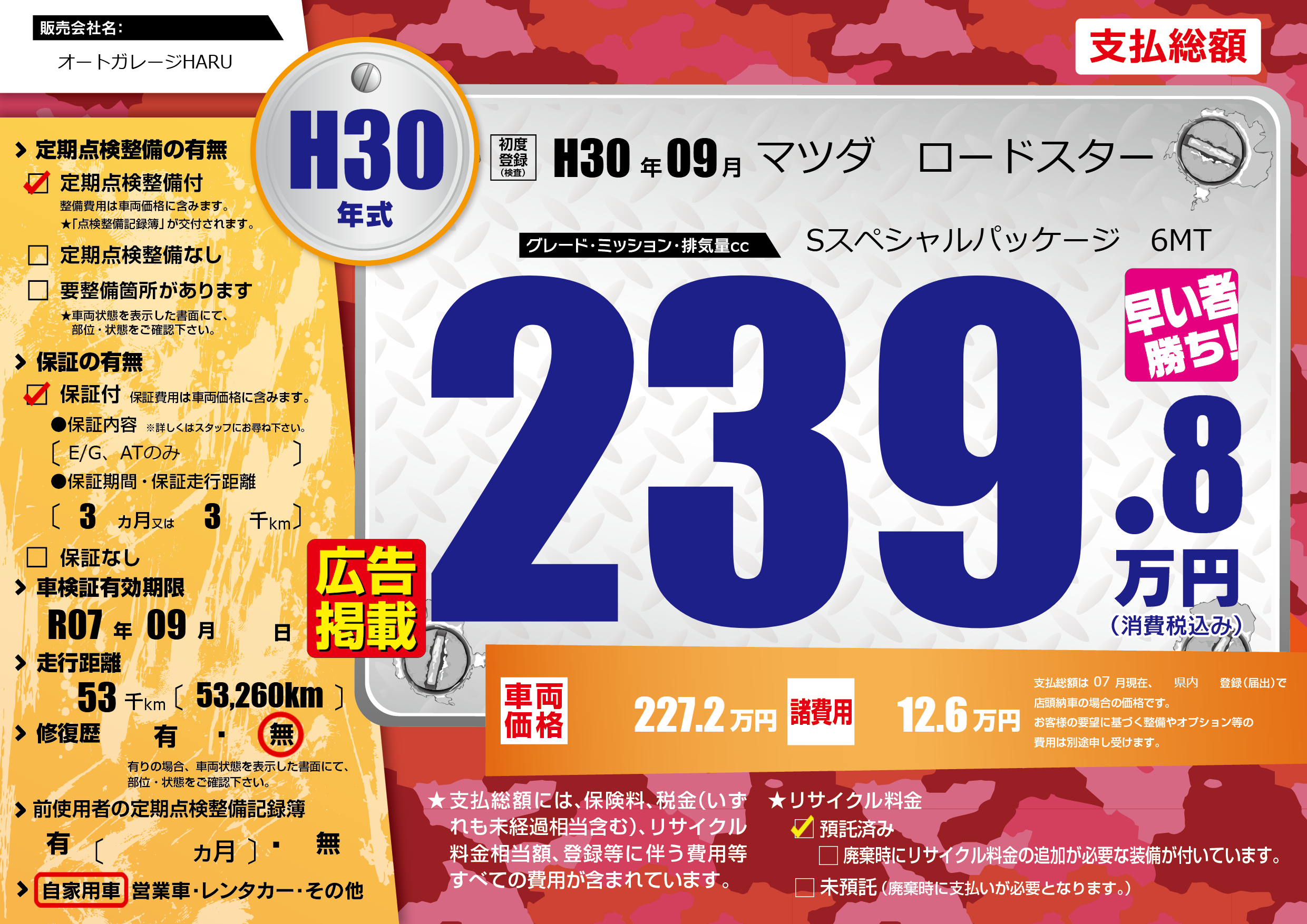 | 車検制限 | R07年 09月 - 日 | ||
