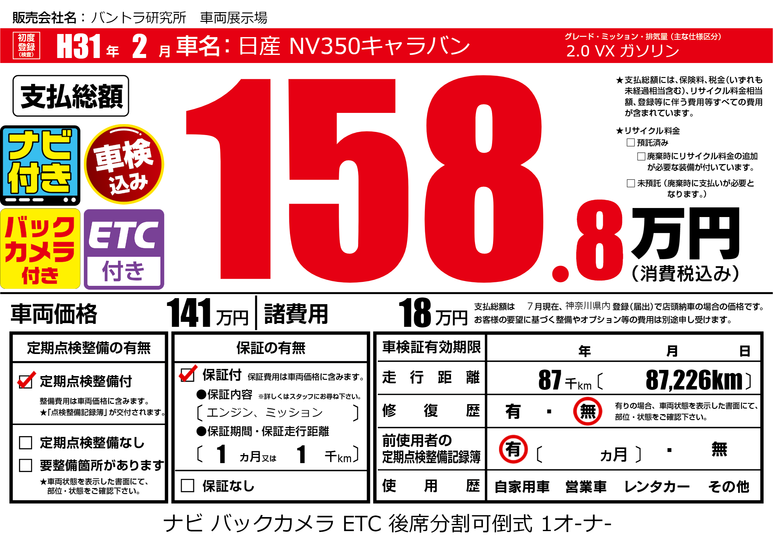 | 車名 | 日産 NV350キャラバン | グレード ミッション 排気量 |