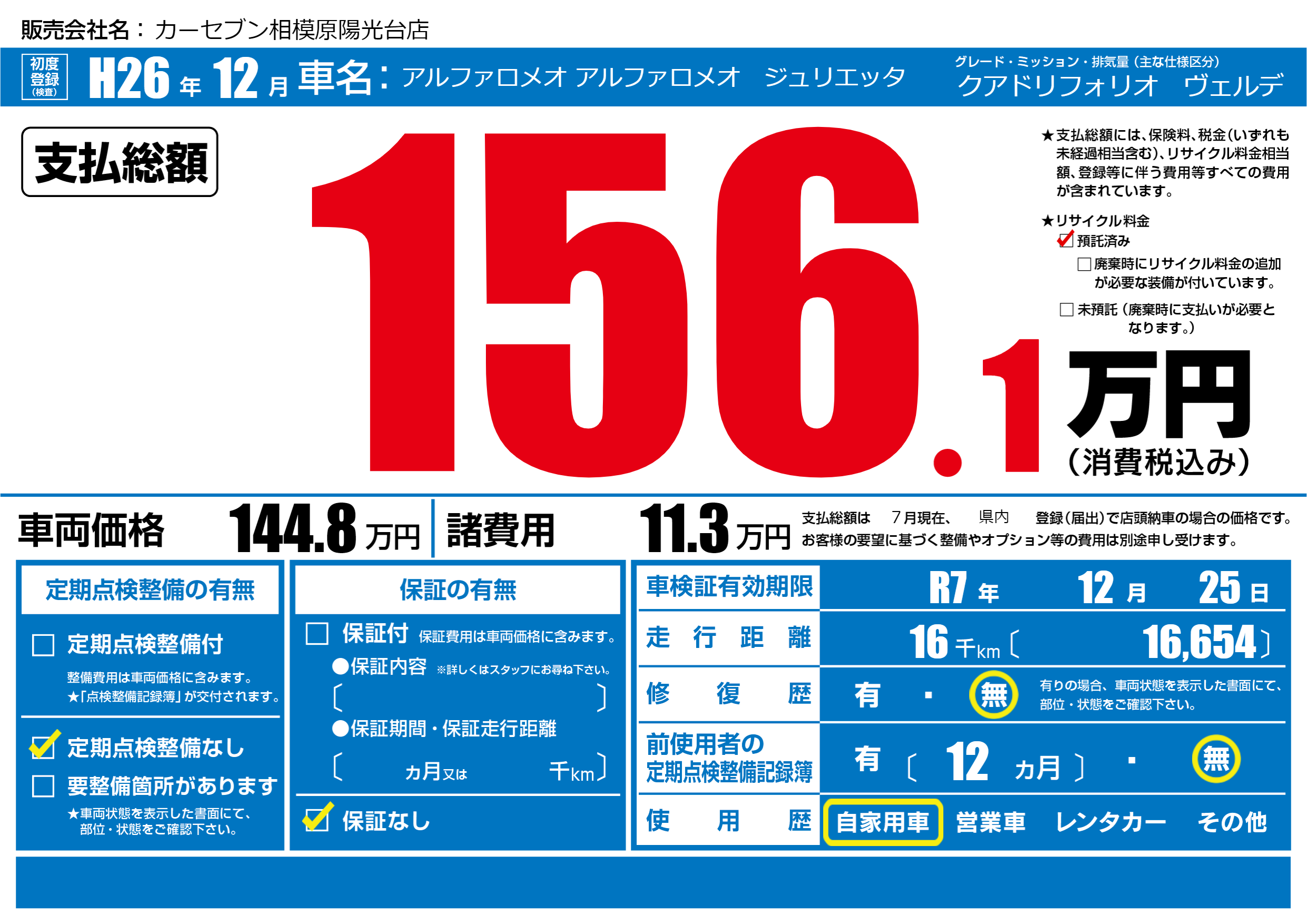| 車名 | アルファロメオ アルファロメオ ジュリエッタ | グレード ミッション 排気量 |