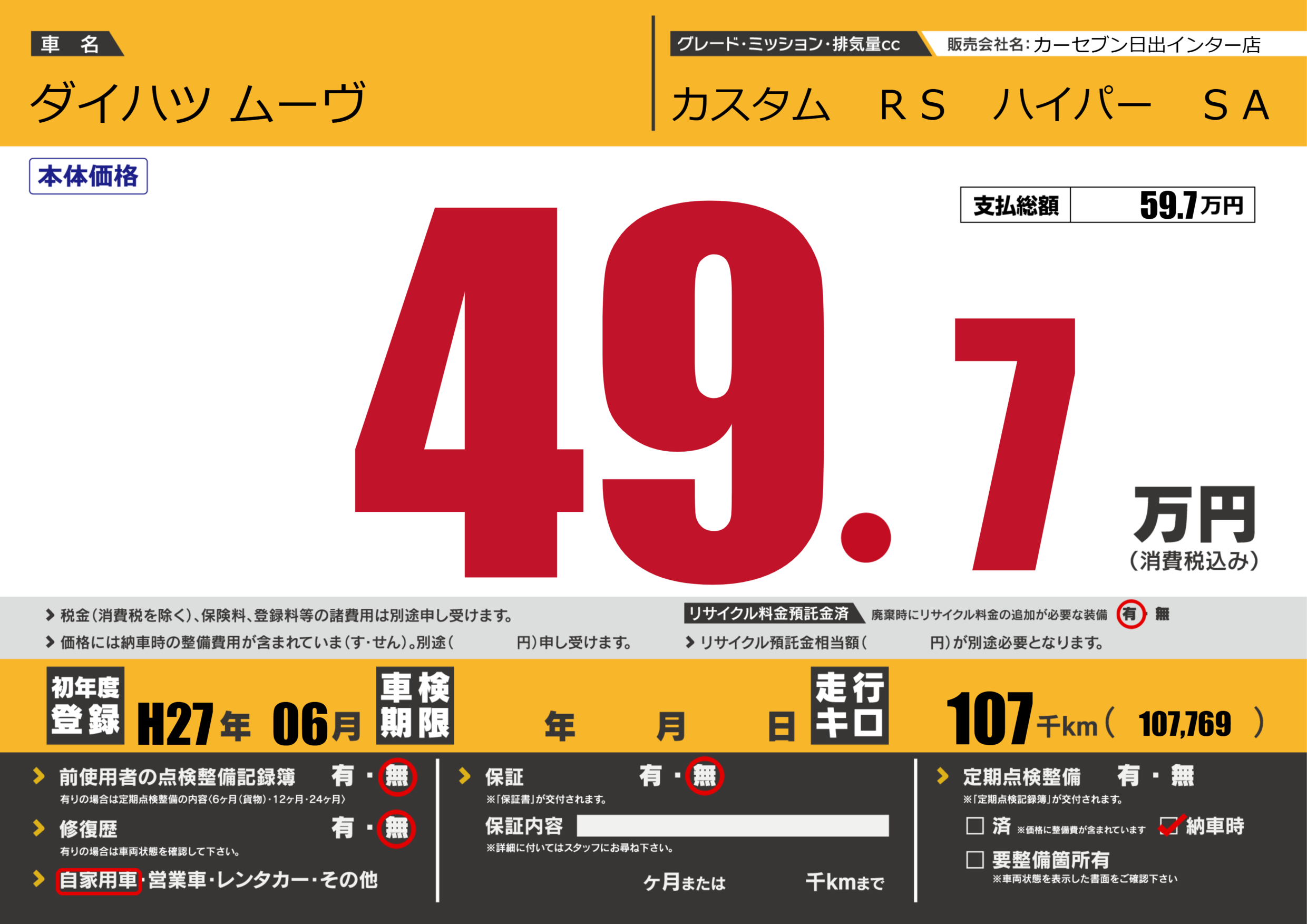 | 走行キロ | 10.7万km | 初年度登録 | H27年06月 |