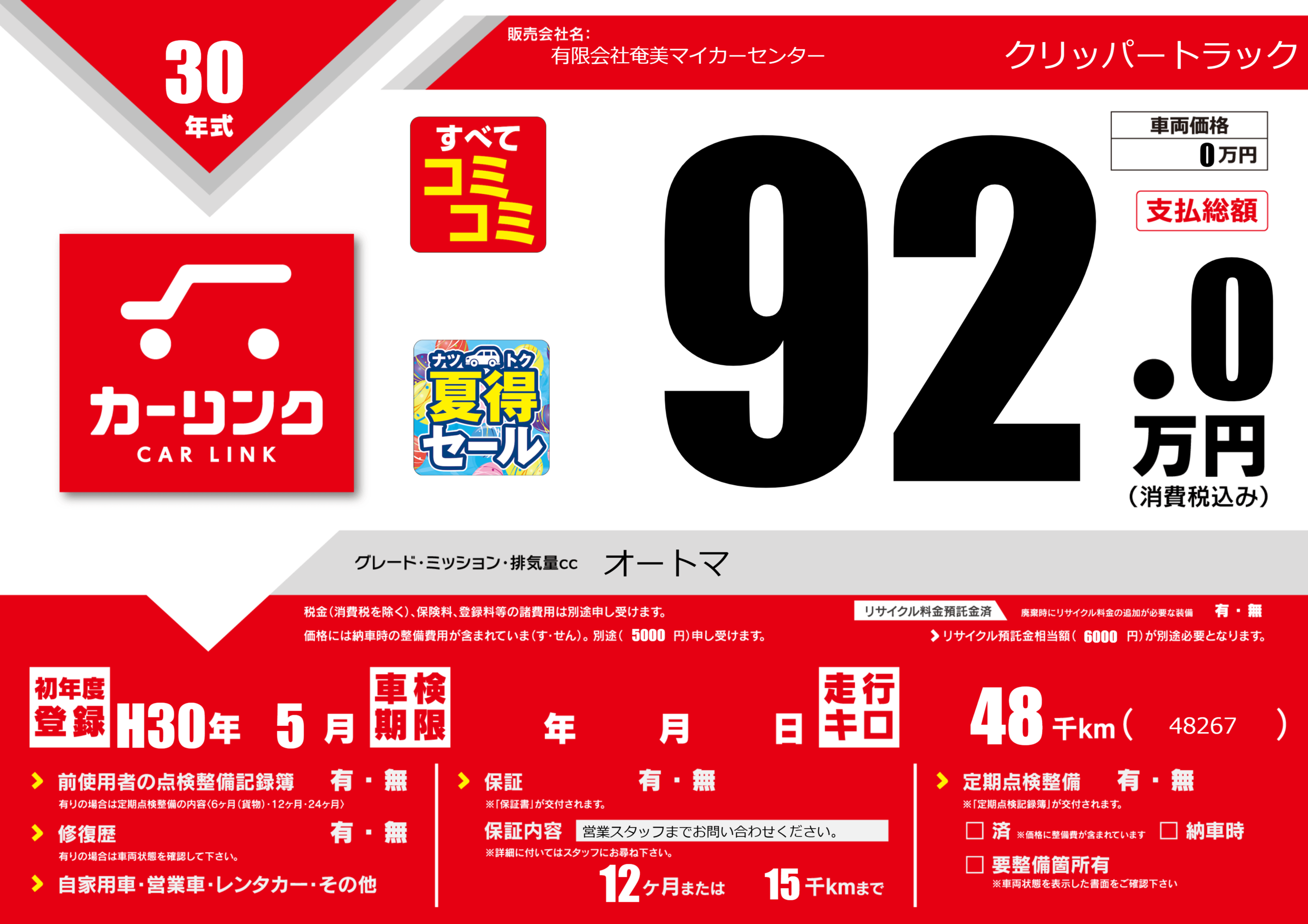 | 走行キロ | 4.8万km | 初年度登録 | H30年5月 |