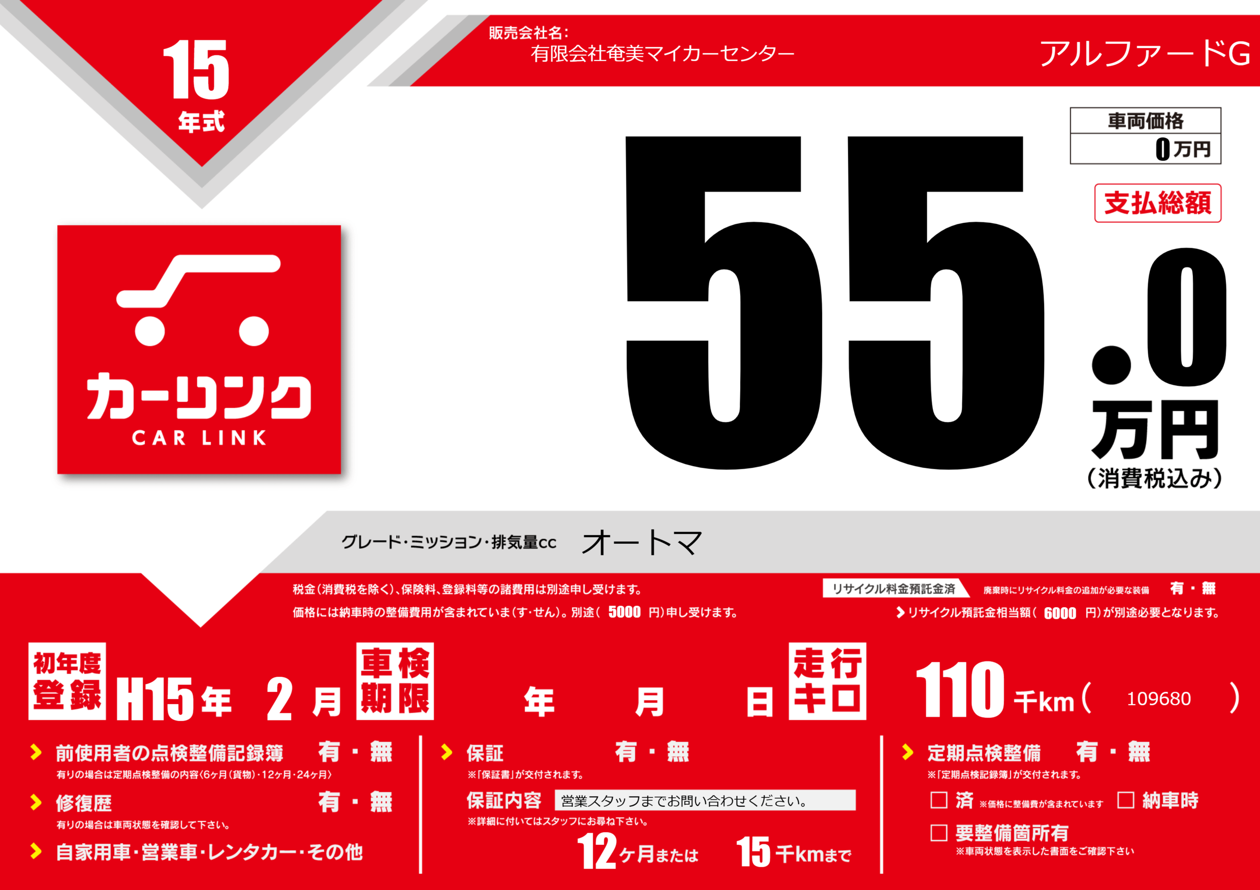 | 走行キロ | 11万km | 初年度登録 | H15年2月 |