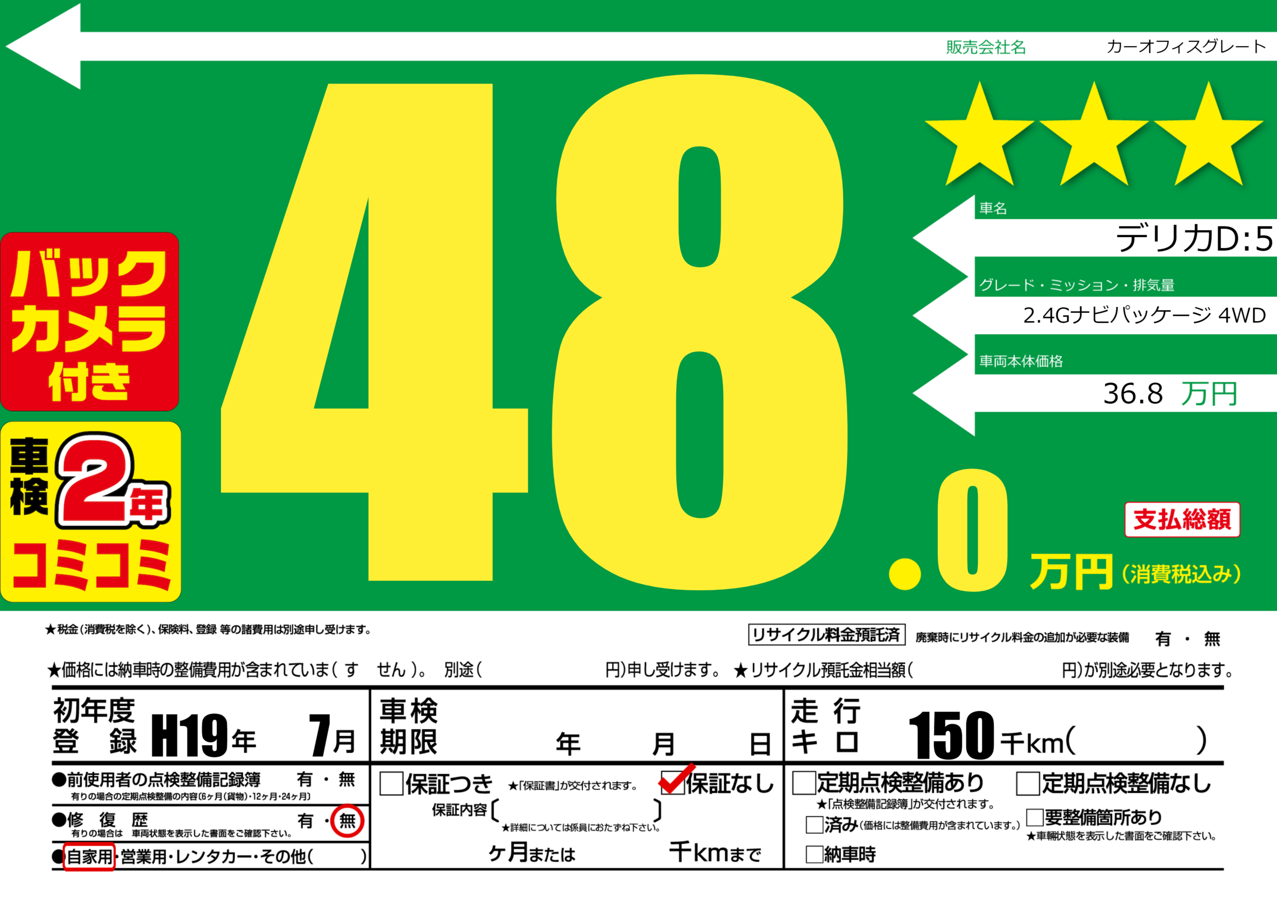 | 走行キロ | 15万km | 初年度登録 | H19年7月 |