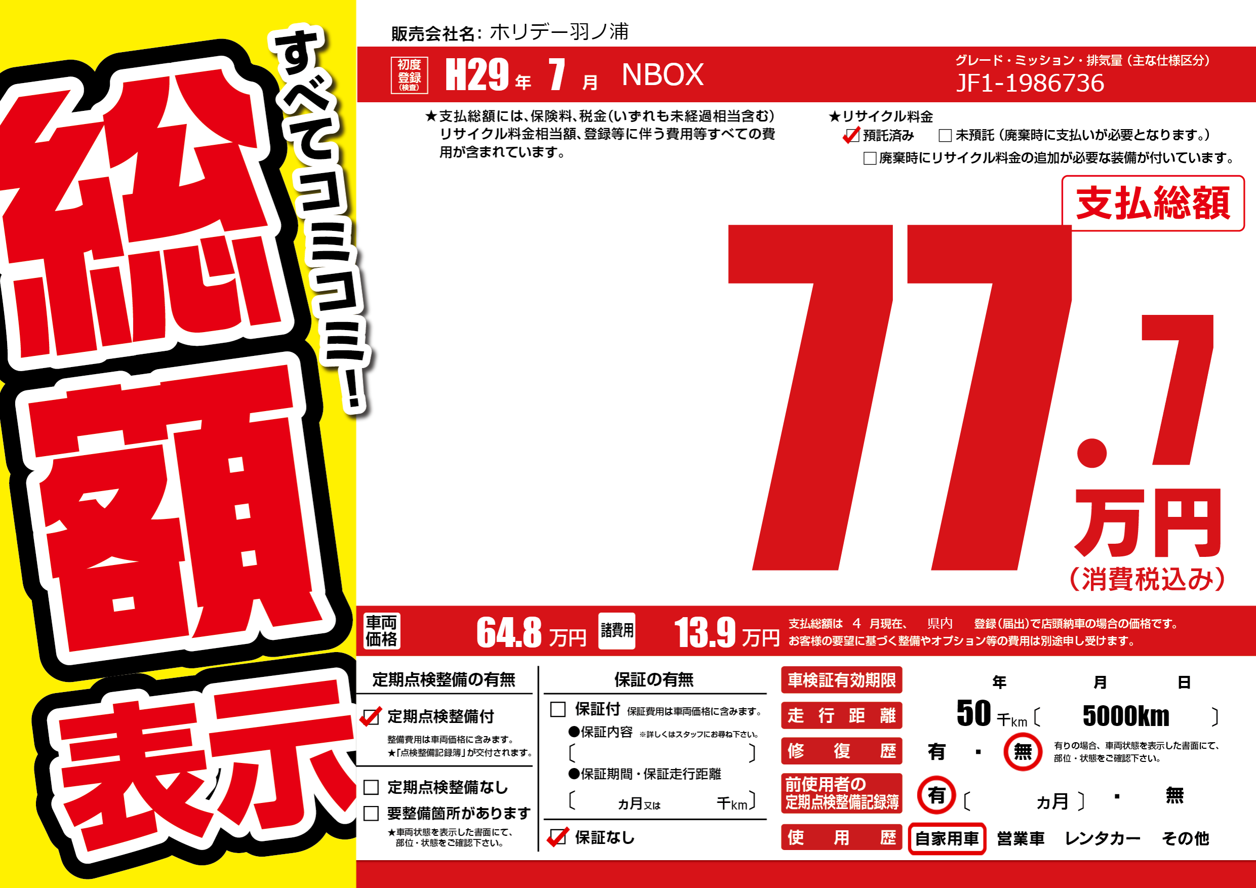 | 車名 | NBOX | グレード ミッション 排気量 |