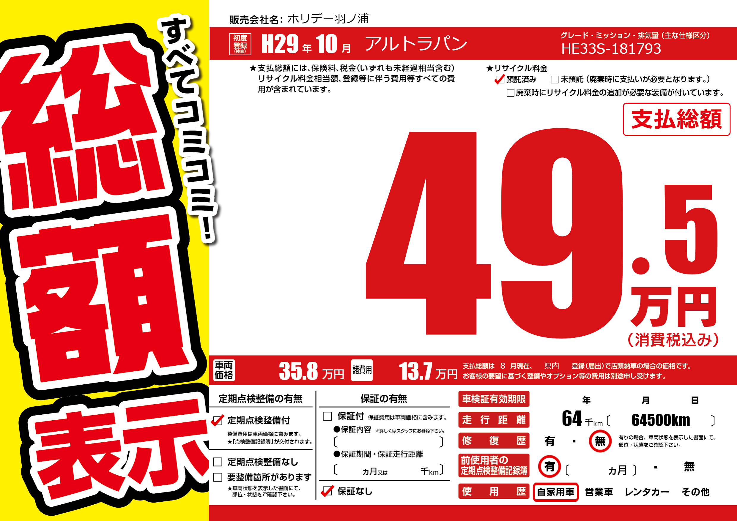 | 走行キロ | 6.4万km | 初年度登録 | H29年10月 |