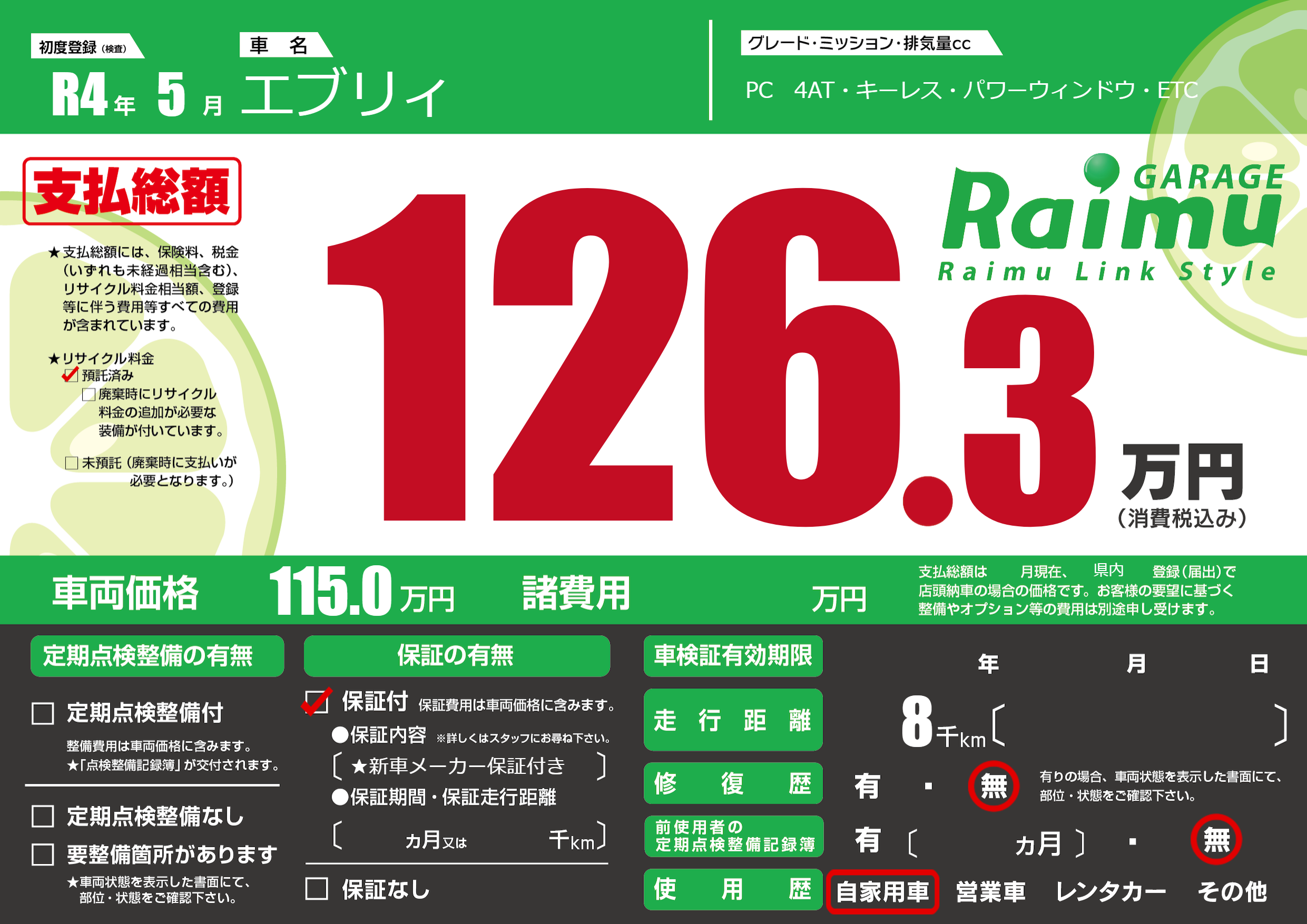 | 走行キロ | 0.8万km | 初年度登録 | R4年5月 |