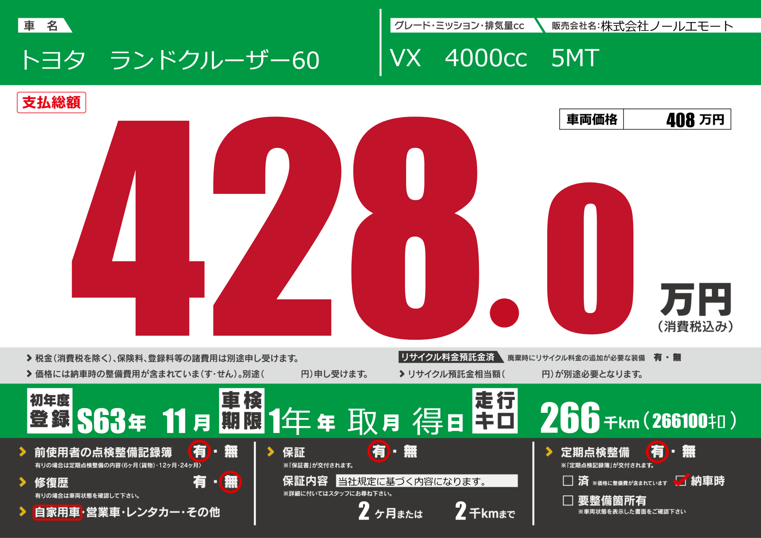 | 走行キロ | 26.6万km | 初年度登録 | S63年11月 |