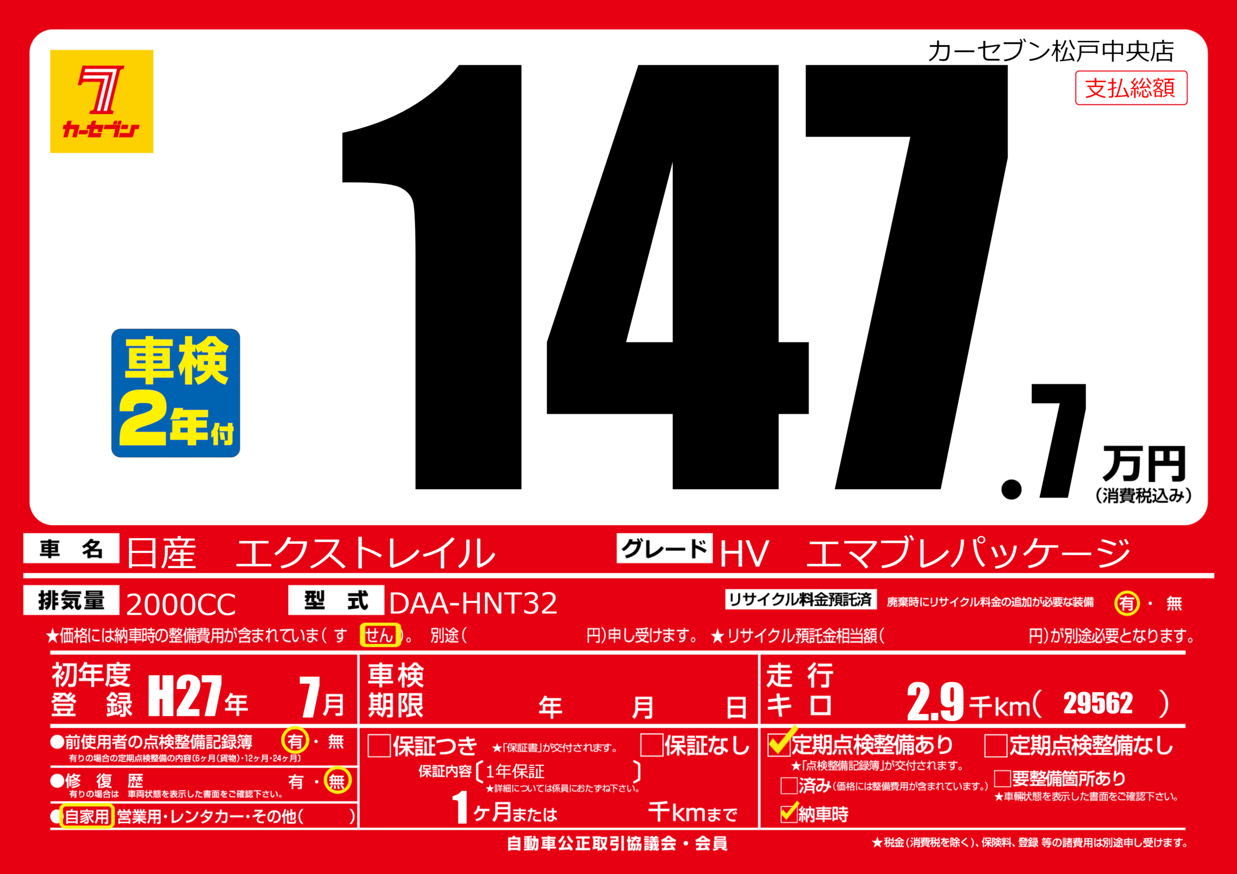 | 車名 | 日産 エクストレイル | グレード ミッション 排気量 |