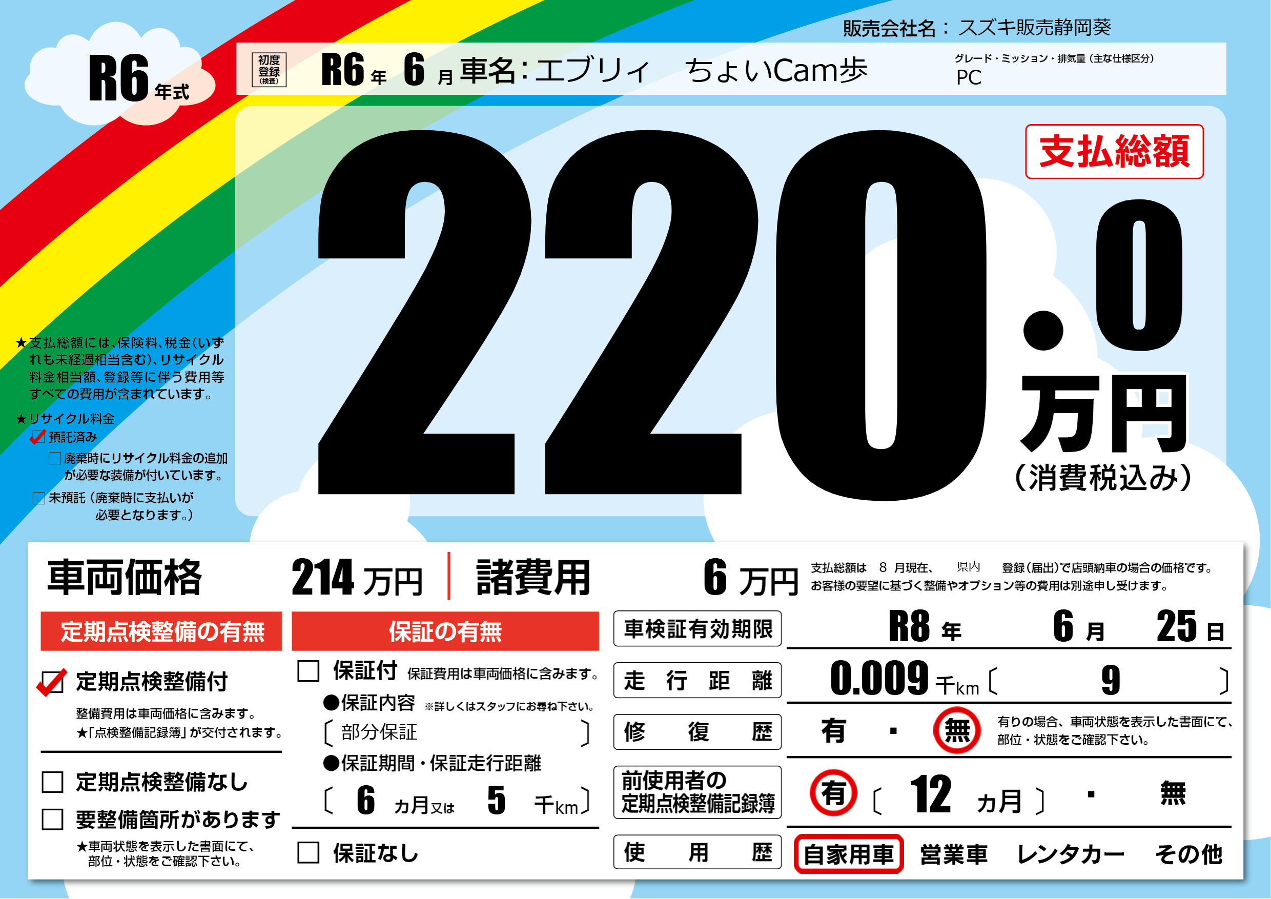 | 車名 | エブリィ ちょいCam歩 | グレード ミッション 排気量 |