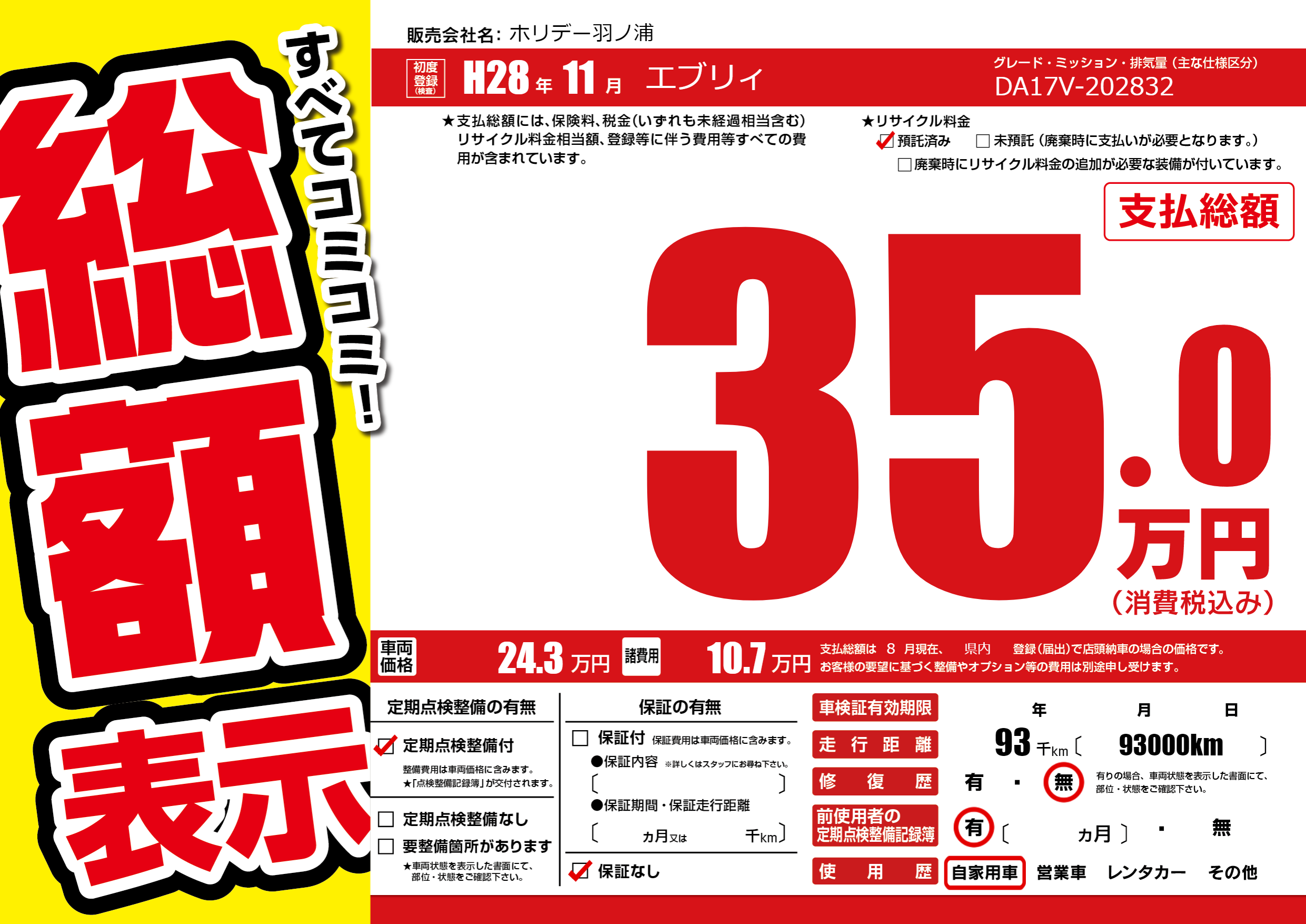 | 走行キロ | 9.3万km | 初年度登録 | H28年11月 |