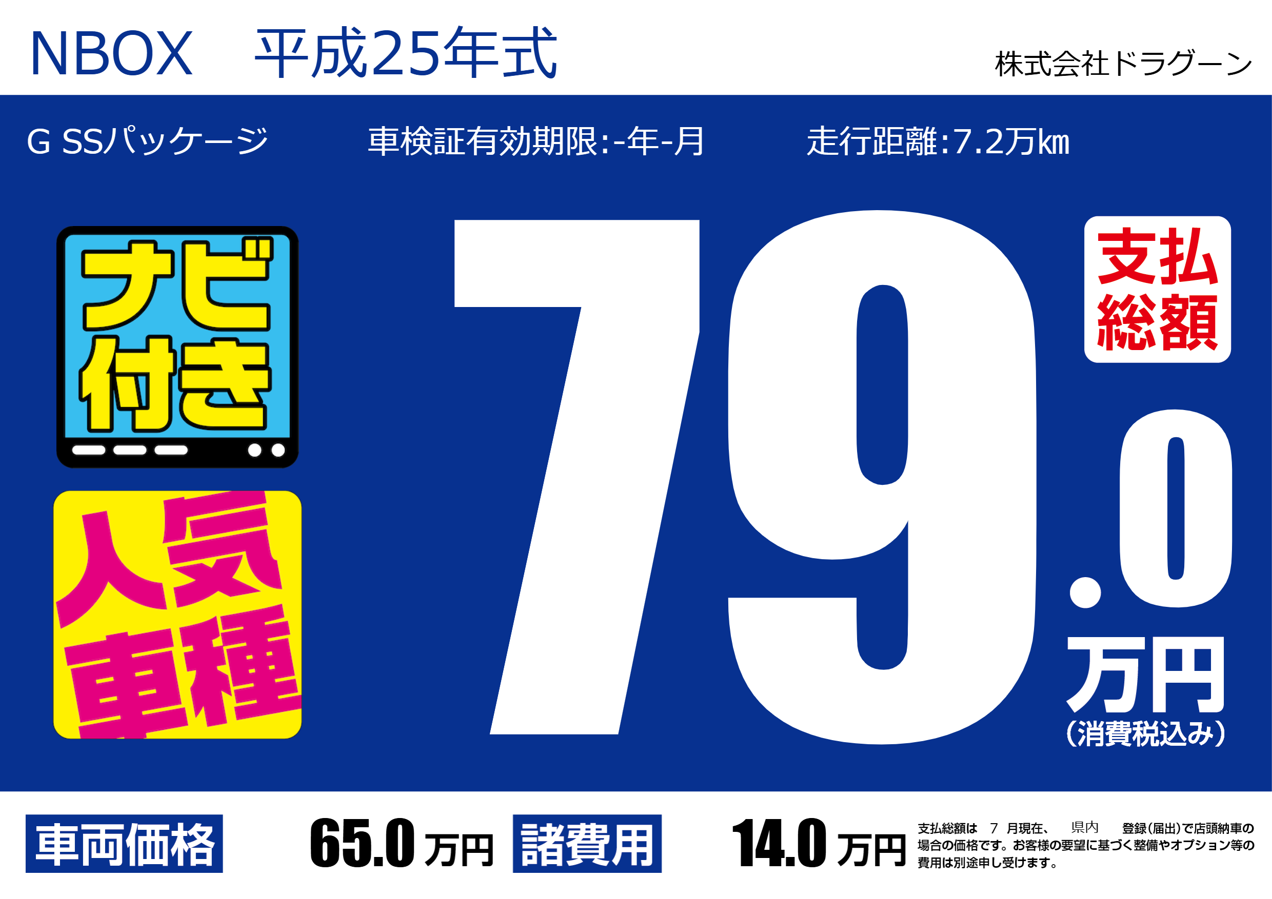 | 車名 | NBOX 平成25年式 | グレード ミッション 排気量 |