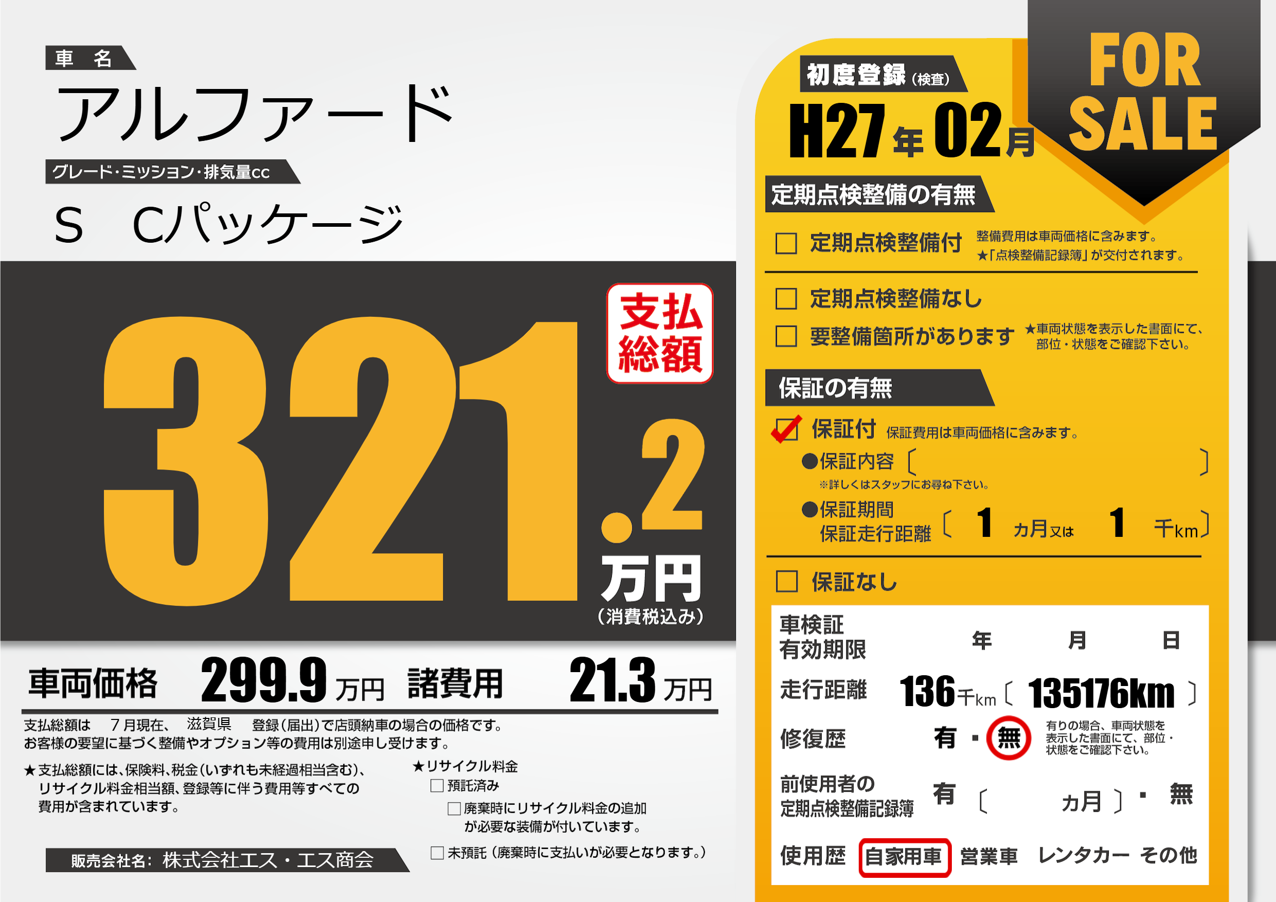 | 車名 | アルファード | グレード ミッション 排気量 |