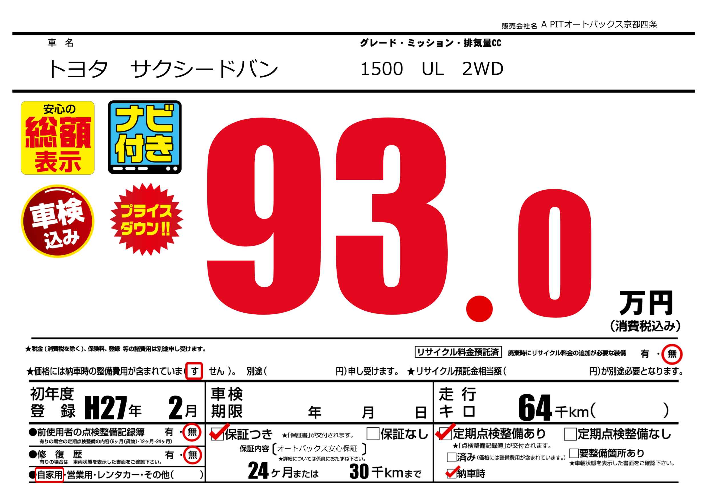 保証なし 保証内容(オートバックス安心保証) 24ヶ月または30千km |