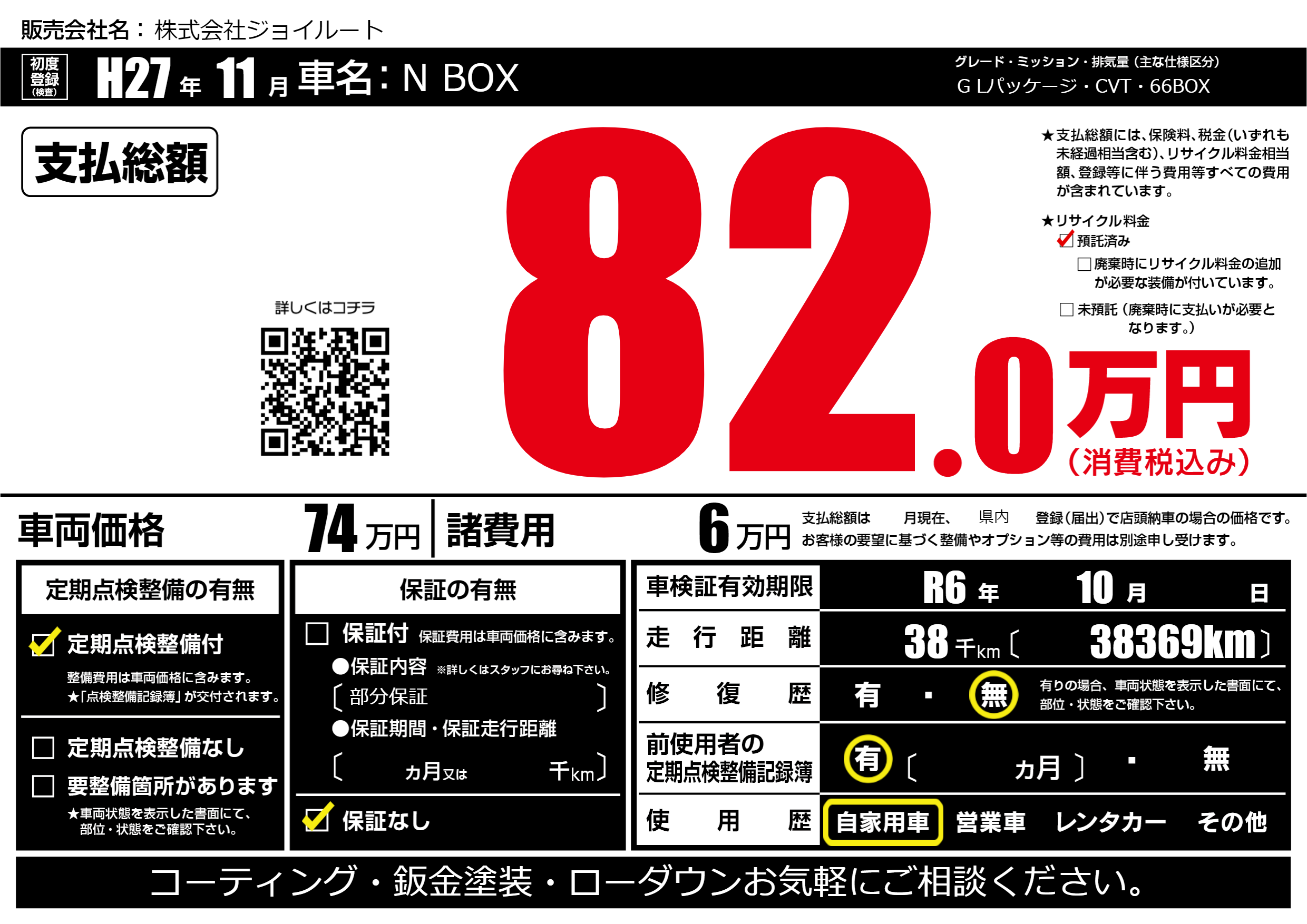 | 車名 | N BOX | グレード ミッション 排気量 |