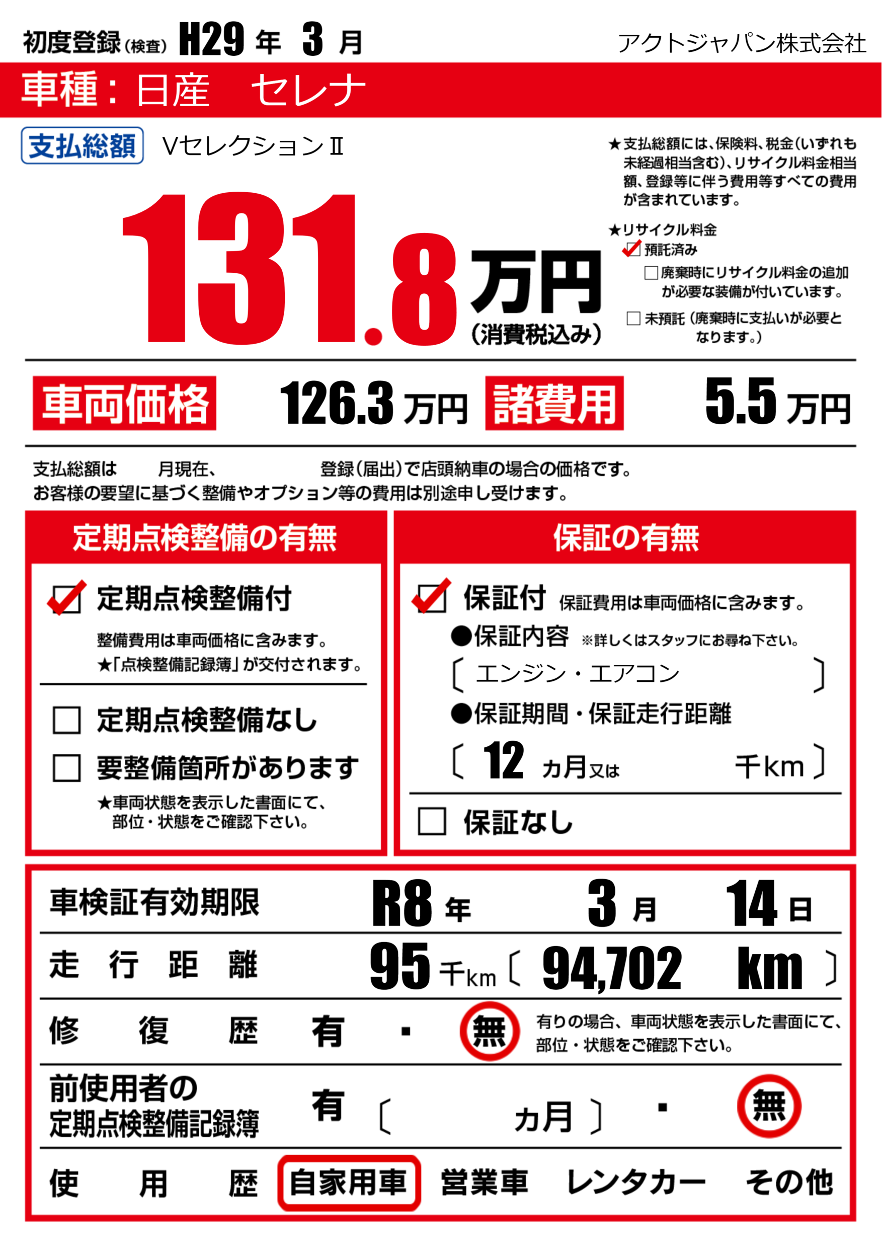 | 車名 | 日産 セレナ | グレード ミッション 排気量 |