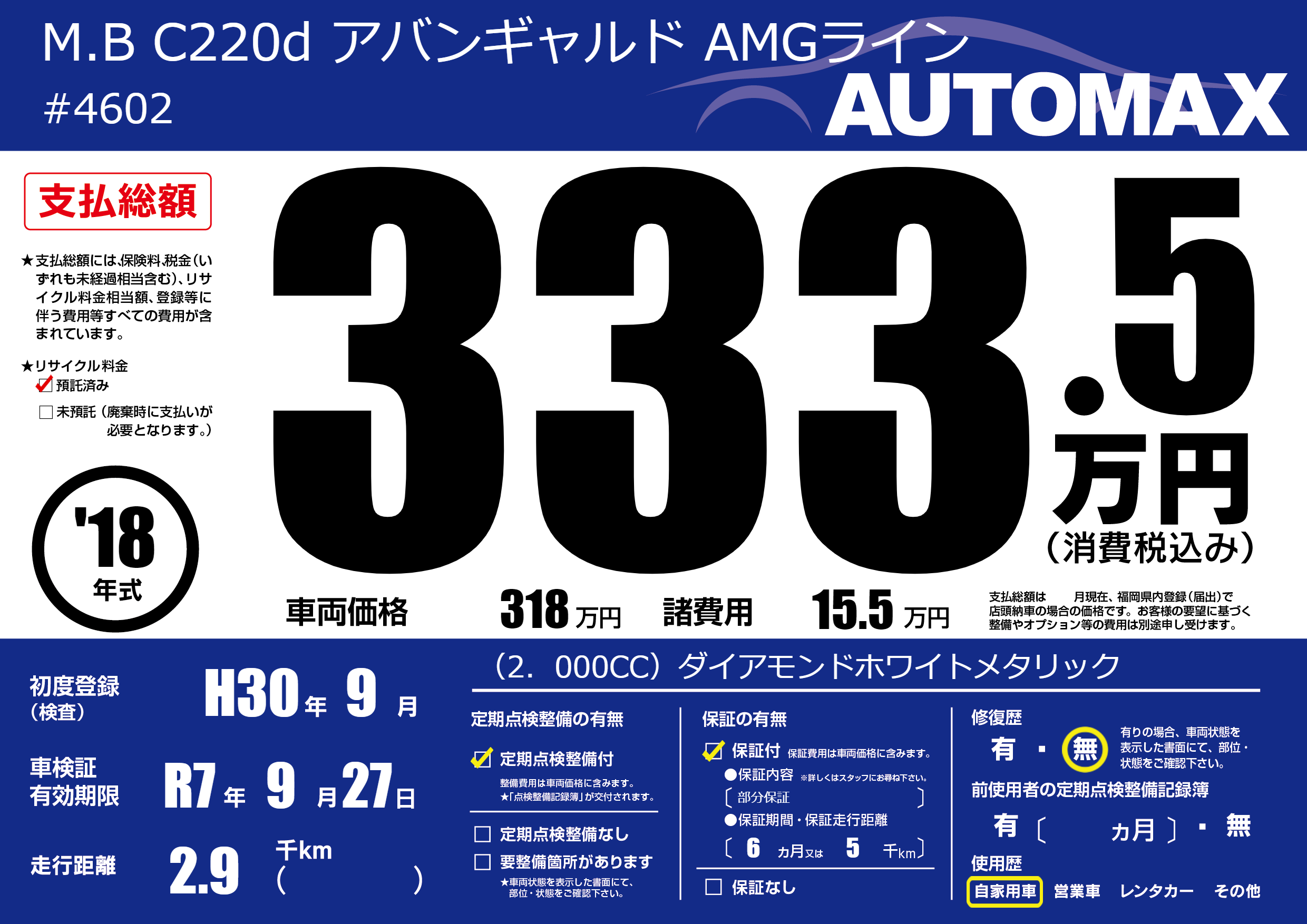 | 車名 | M.B C220d アバンギャルド AMGライン | グレード ミッション 排気量 |