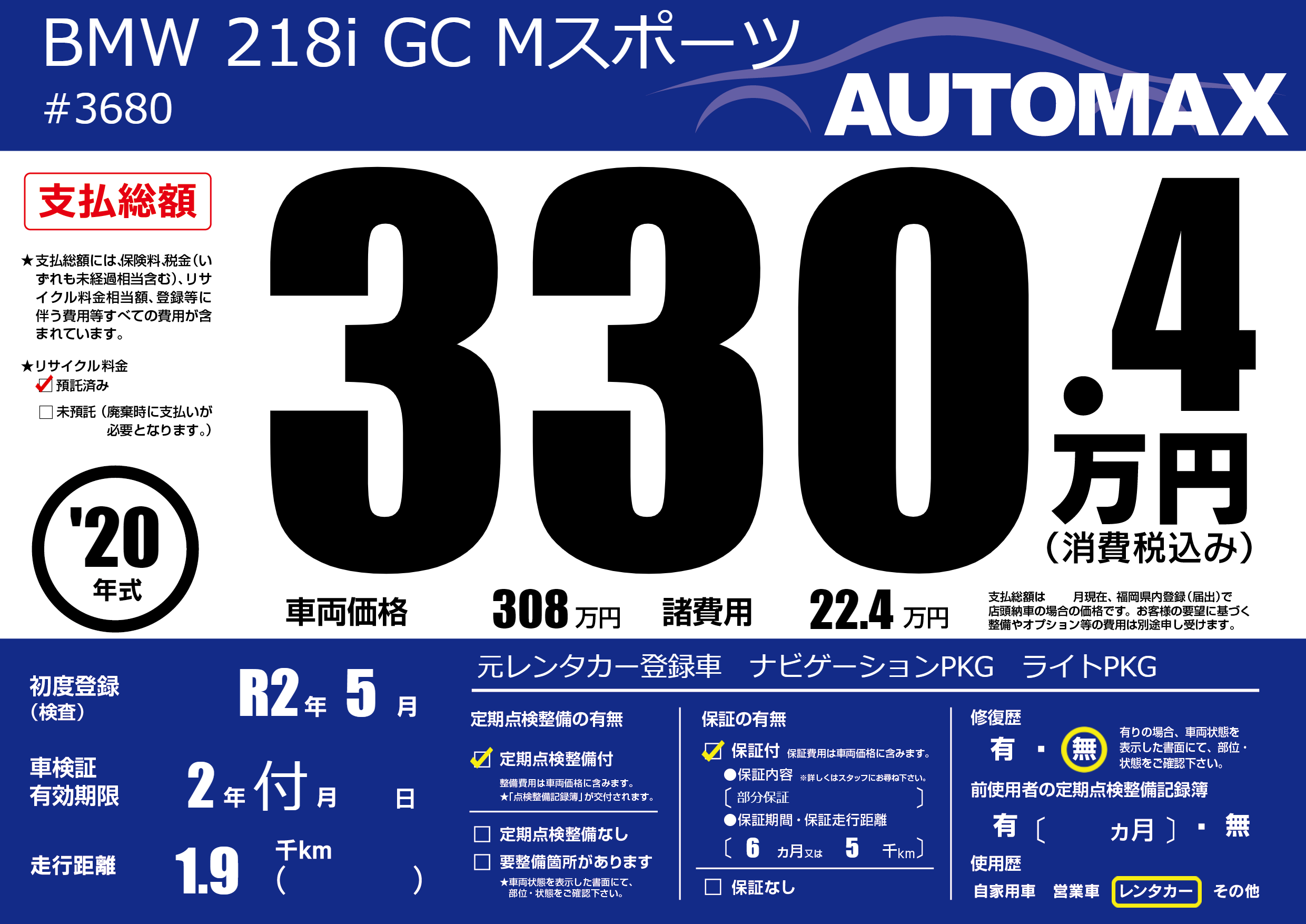 | 車名 | BMW 218i GC Mスポーツ | グレード ミッション 排気量 |