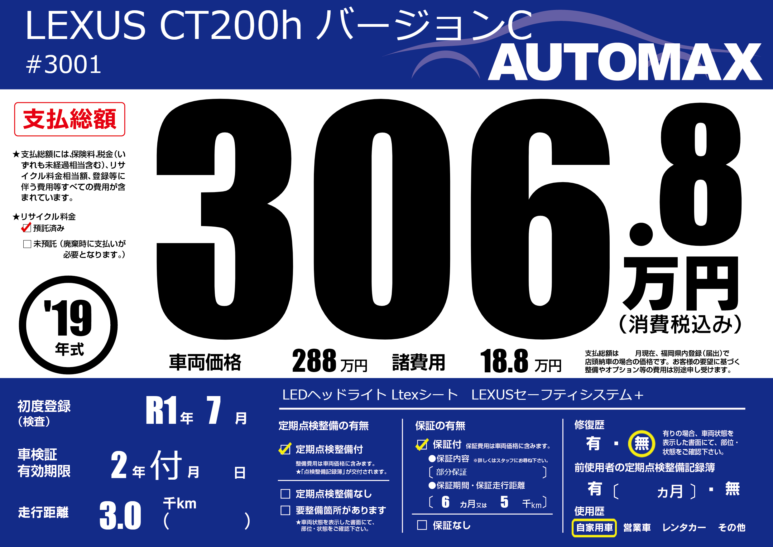 | 車名 | LEXUS CT200h バージョンC | グレード ミッション 排気量 |
