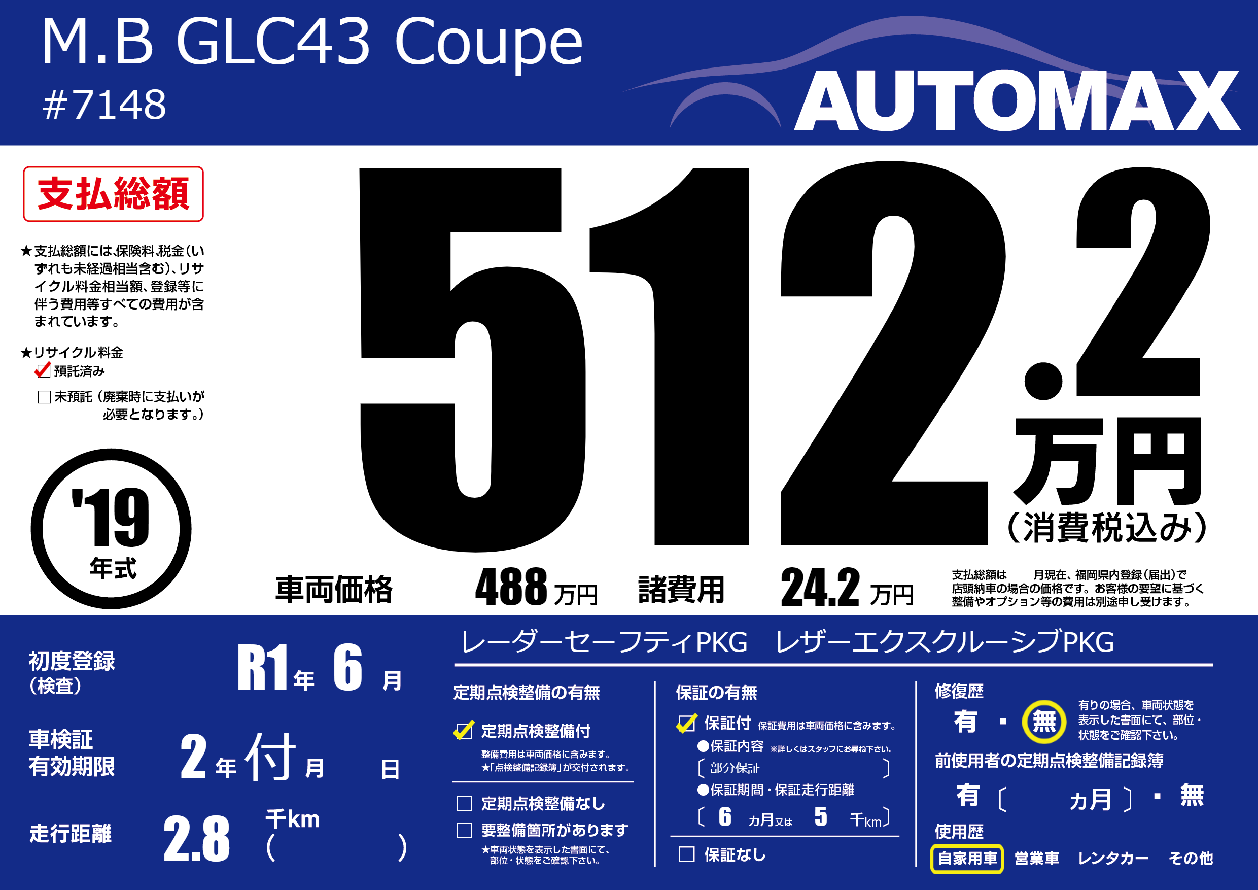 | 車名 | M.B GLC43 Coupe | グレード ミッション 排気量 |