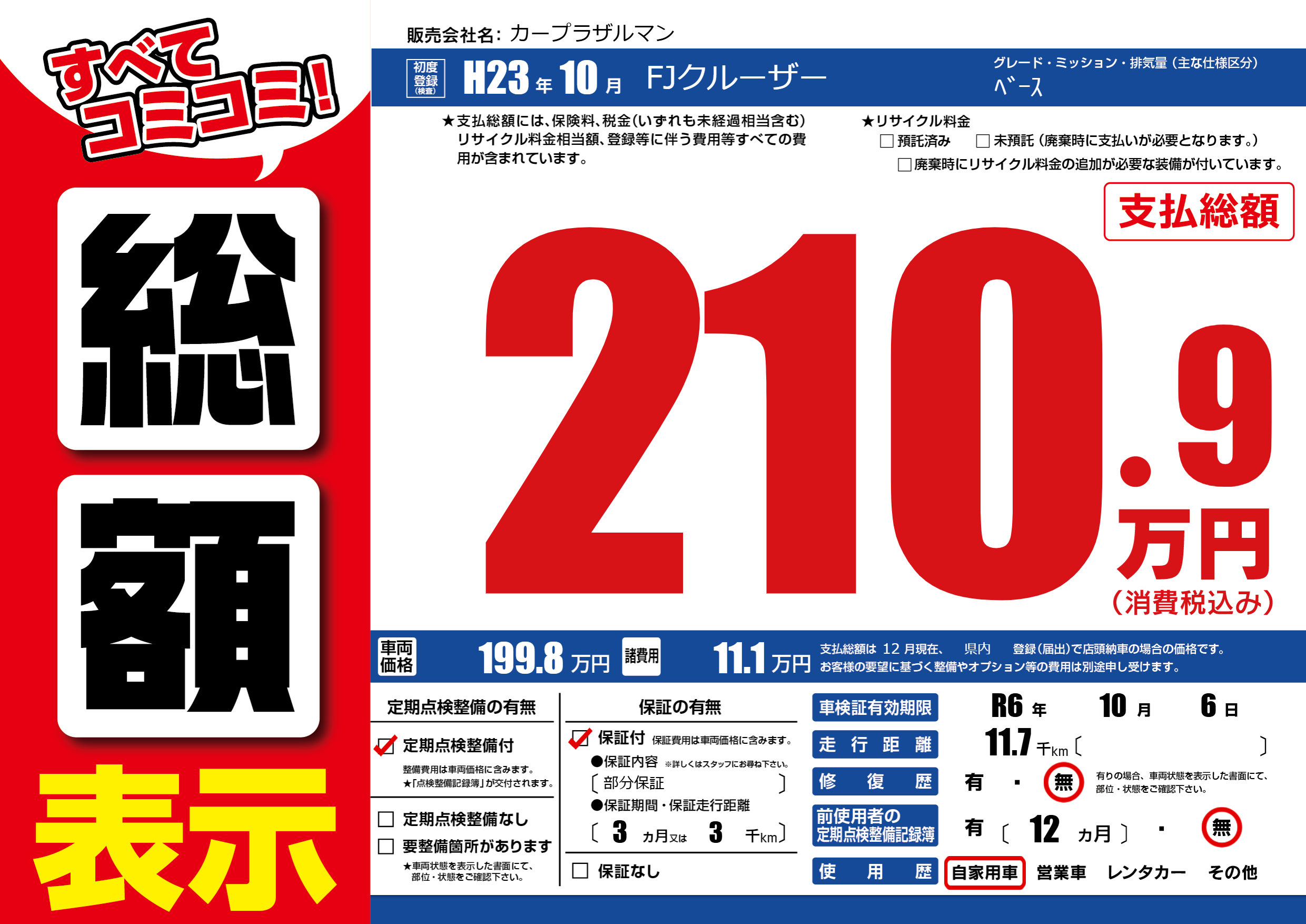 | 車名 | FJクルーザー | グレード ミッション 排気量 |