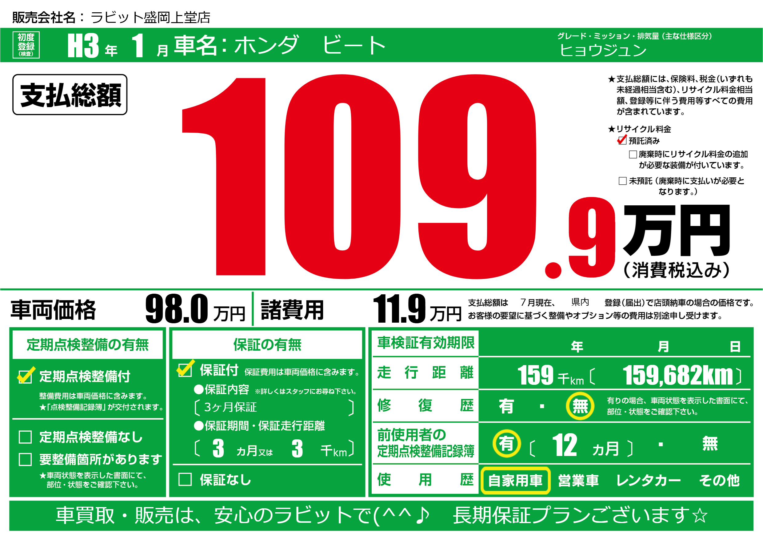 | 走行キロ | 15.9万km | 初年度登録 | H3年1月 |